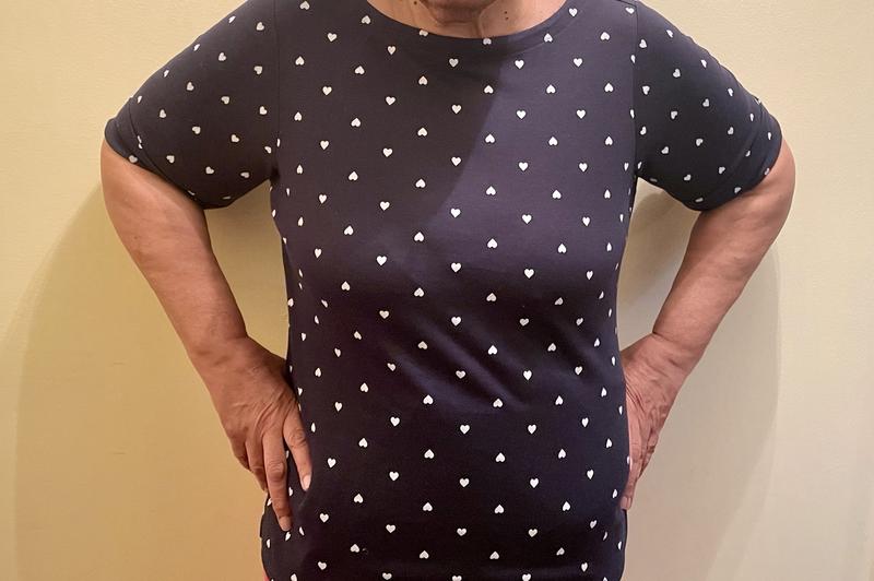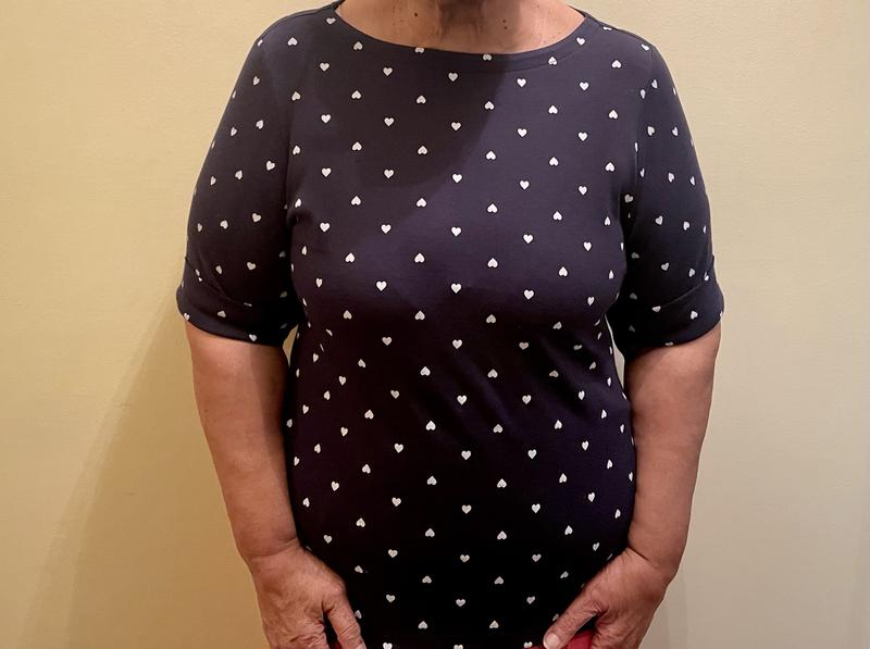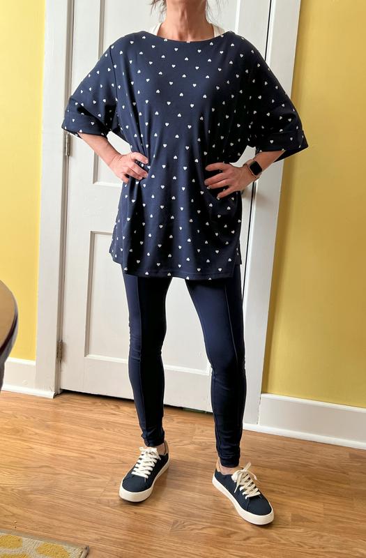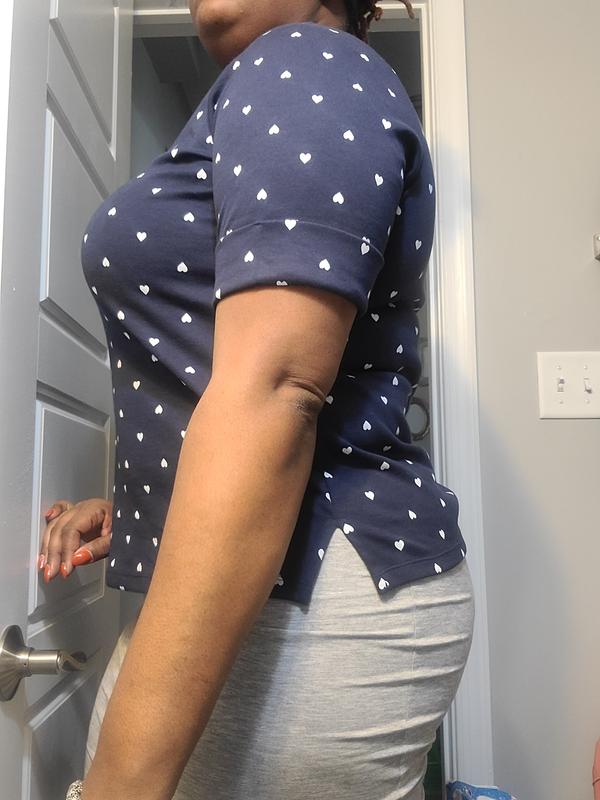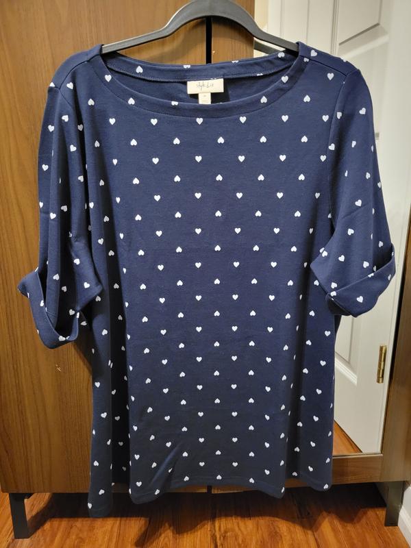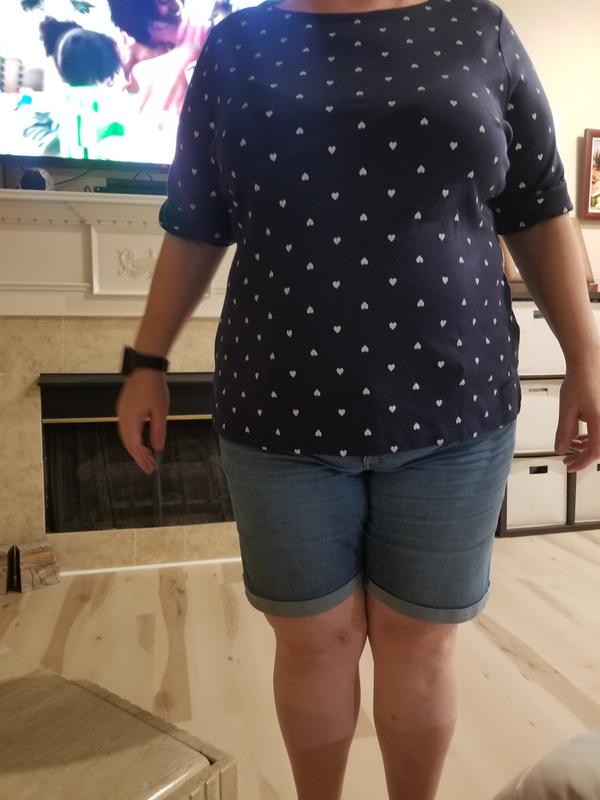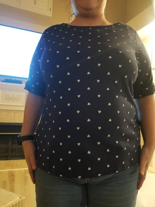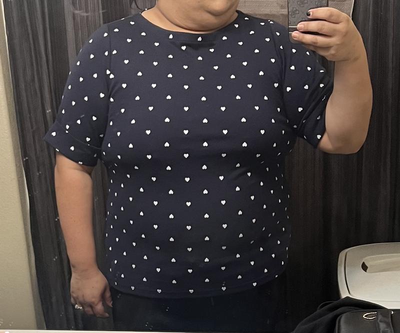 This cute navy blue elbow sleeve cotton/polyester top with white hearts will be a useful addition to your wardrobe. It runs true to size (1X). Nice length and weight. It can be worn all seasons casual with jeans or dressed up with a jacket and slacks. I love it!!!