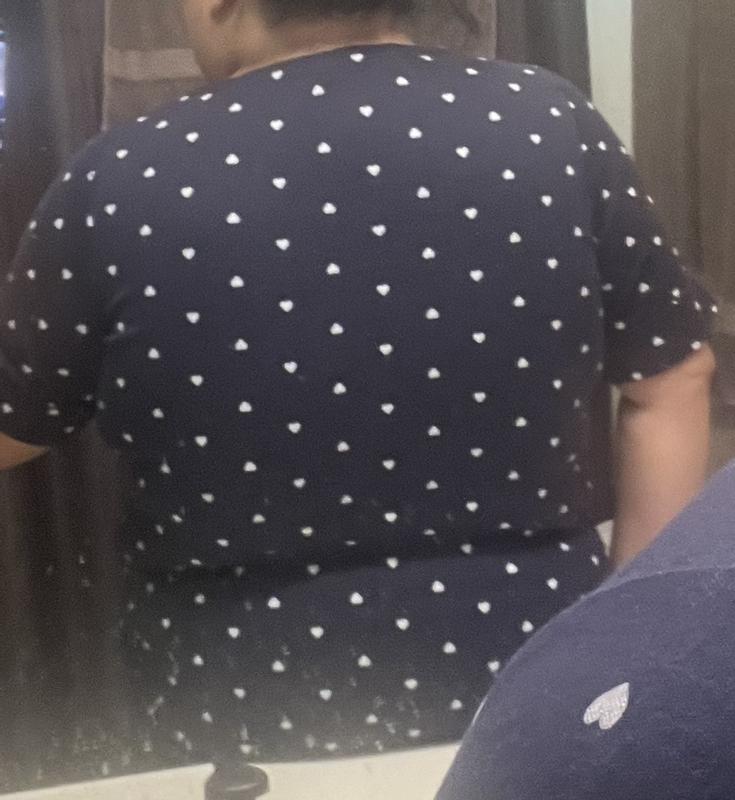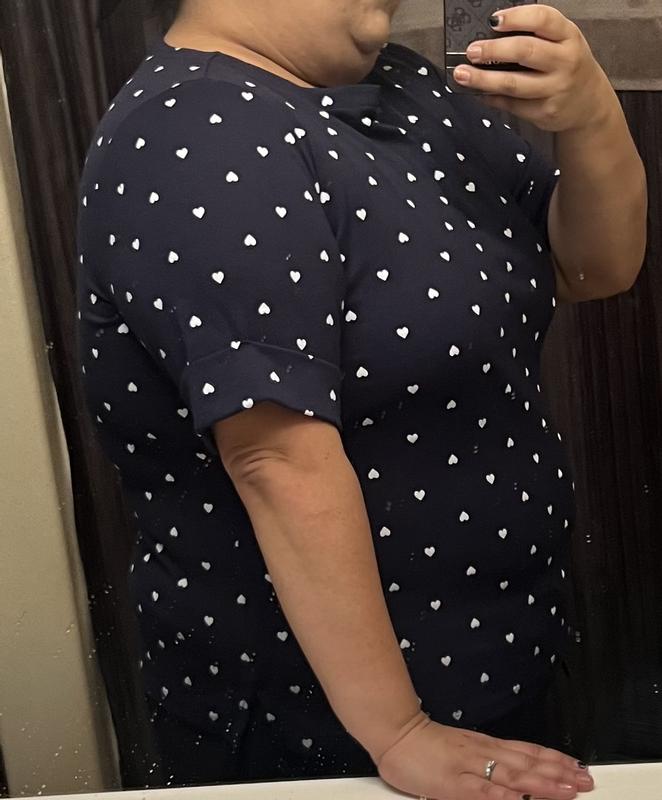 Nice blue top with little white hearts print. Very comfortable, soft and little stretchy. Great quality. Looks kind of dressy. Good for a restaurant or business meeting. Flattering on a curvy person. Love it!