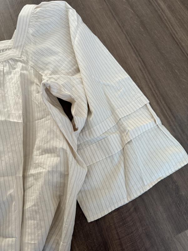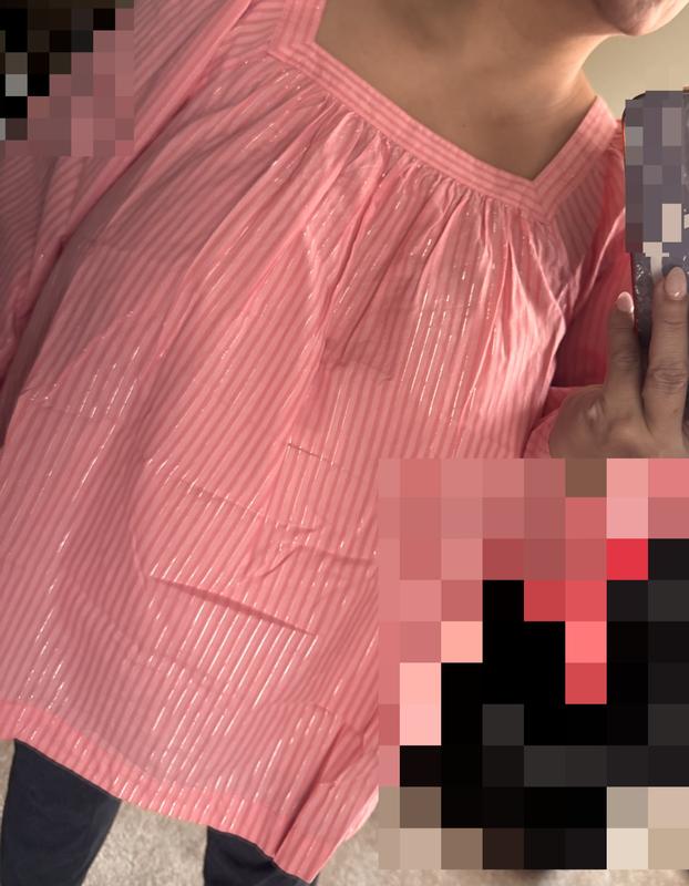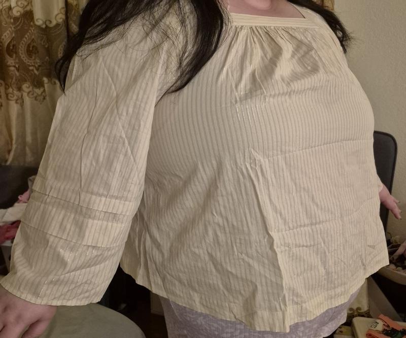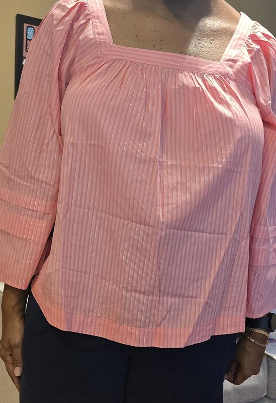 Top is cute. I love the square neckline. The fit is somewhat boxy for the body, but expected. The sleeves are cute and the gold running through the fabric is beautiful. Nice top. Easy to wear. Gold in fabric gives more options on dressing up the top or go casual.