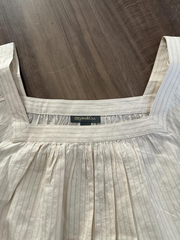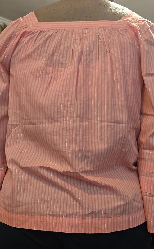 I love the top's neckline and back cutout. The top is very flattering, flowing, and modest. I also love the peach color with its shiny vertical stripes. Great top for the beach, park, picnic, or casual day at work. I wore it for a Labor day weekend BBQ.