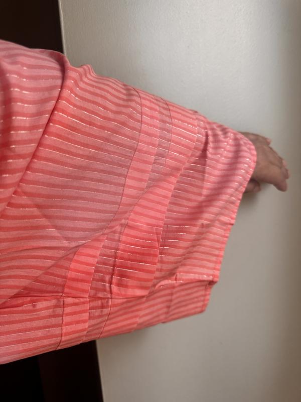 it’s okay.. pretty color. this shirt is super thin and see-through. You’ll need a camisole underneath. pretty vibrant bright pink color. the fit is super loose. it does fit like a tent effect. it billows over the chest .