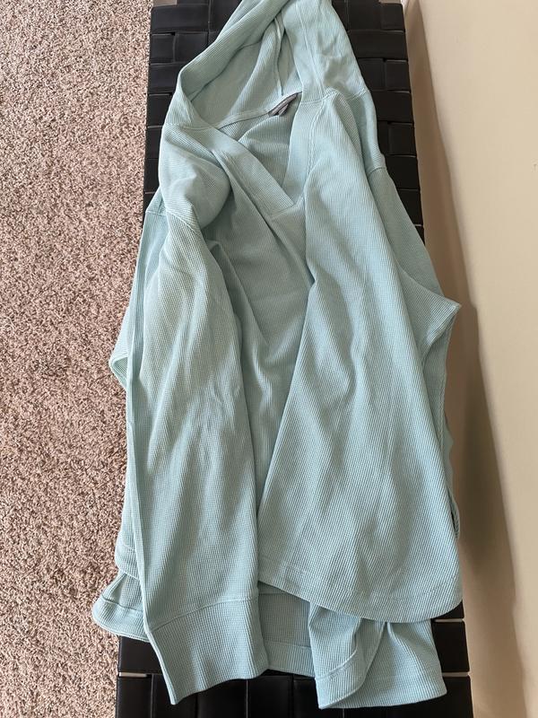 Very lightweight hooded long sleeve shirt. *Not a sweatshirt* Waffle weave is very thin, almost see through. Do not expect it to keep you warm. Very comfortable and roomy, well made with reinforced stitching. Made of cotton, recycled polyester and spandex. Features a v neck, side slit, high low hem and ribbed cuffs. Cool wash/cool dry.