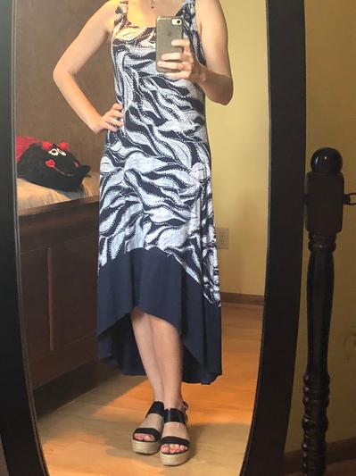 This is definitely a nice dress to add to your collection for summertime. It fits nicely, not too big or too small in size. It has a nice length, and will keep you cool on hot days!