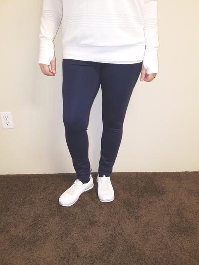 These pants fit true to size and have a nice amount of stretch to them to accommodate your curves. The material is thick like a regular pant but fits like a legging. Super comfortable!
