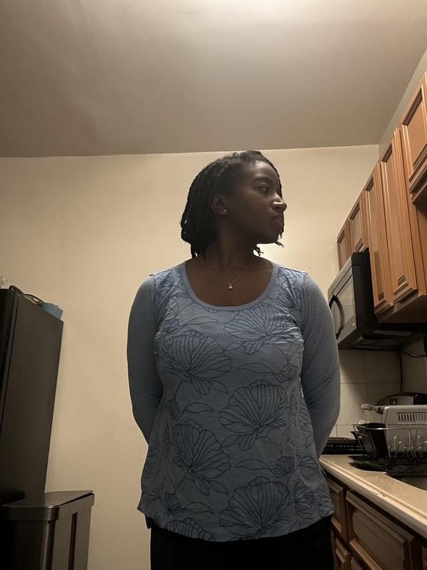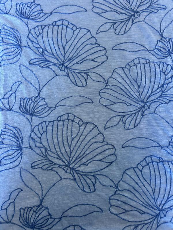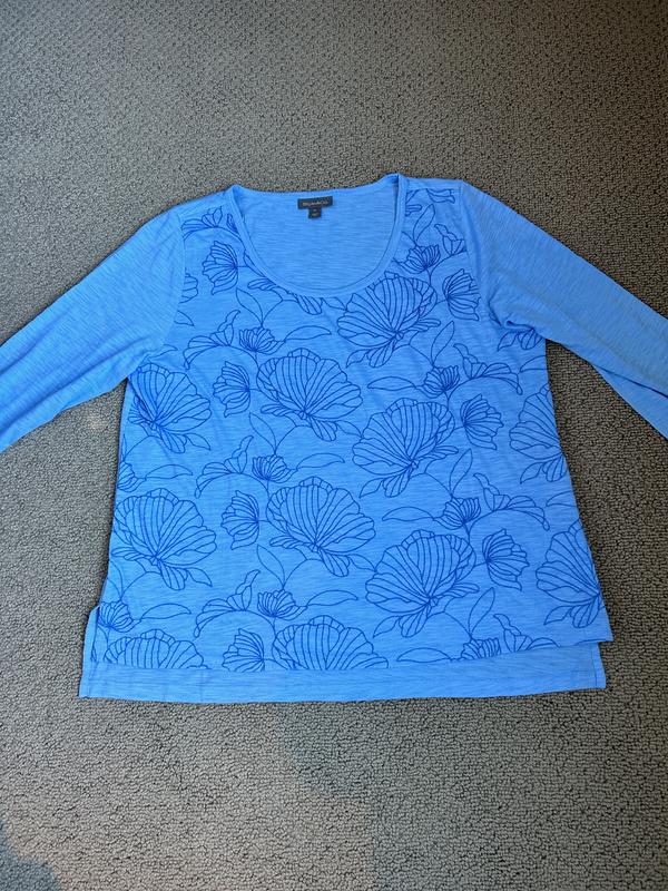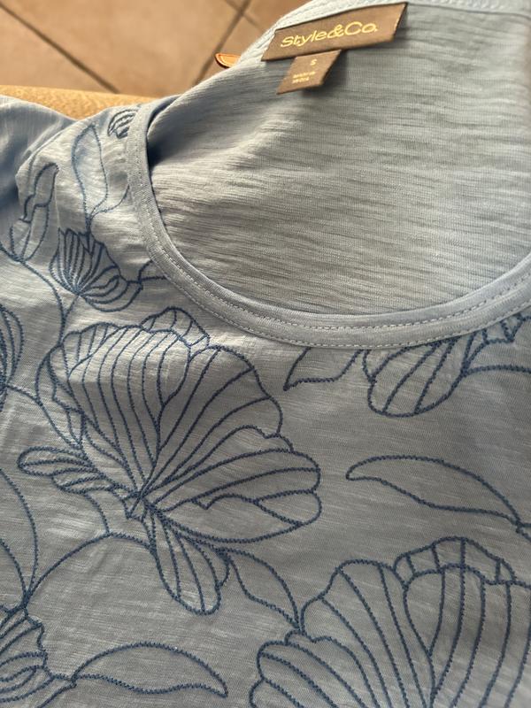I was very happy with this top. It is cotton and cotton modal and that is why it is soft and comfy! I ordered a large in this and I usual wear a XL but I can usually tell if I need to downsize just looking at the online pic because Style and Co tends to be generous when it comes to sizing and it fits great! The blue is a nice shade and the slightly darker blue embroidery on the front is really pretty and not over done. I washed it but hung it to dry which I always do with cotton. It stayed in shape well. It is on the thin side but I like that, living in a warm area.