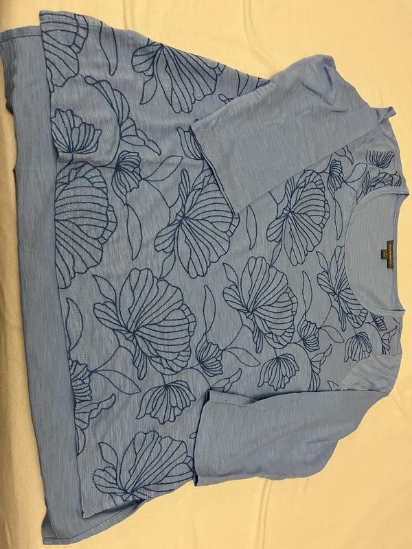 This is a very nice top. It’s versatile, comfortable, lightweight, however, not too thin. Great material, good fit and style. The front is embroidered which looks good with jeans or can be used with a more dressier outfit. Beautiful blue color.