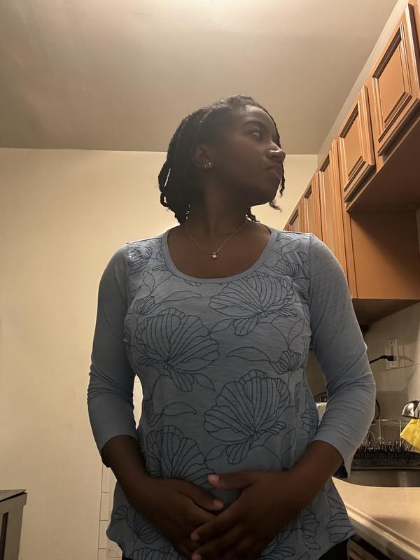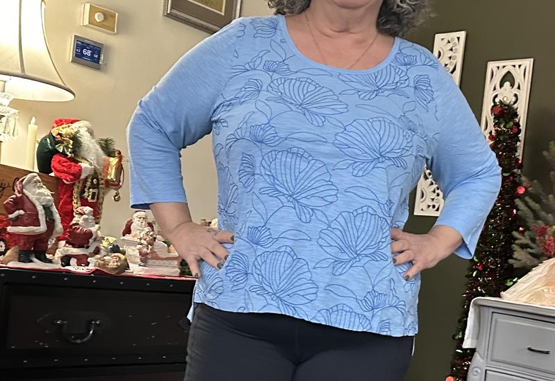 This 3/4 sleeve scoop necks adorable and perfect for warm weather. The seashell print is cute and adds a nice touch, and the fabric is very lightweight and breathable. It feels cool on the skin making it a great option for spring or summer. The fit is comfortable and easy to wear, and it looks great dressed ups or down.