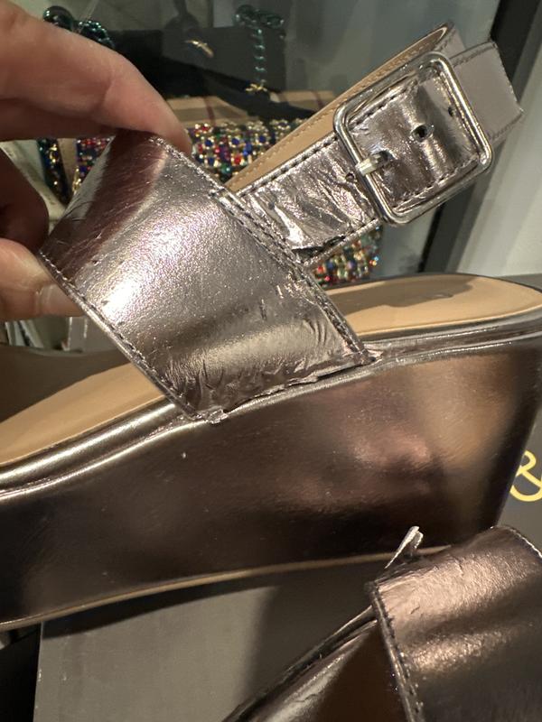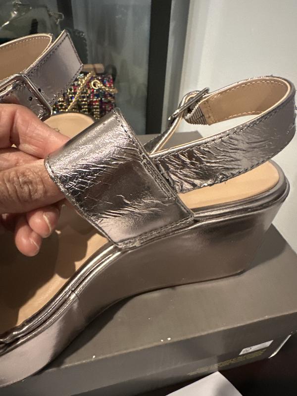 Bought these shoes quite a while ago. I loved the idea of a wedge in a pewter color. I wore them 1x and realized the pewter was peeling from the bottom. I wore them a second time and the pewter covering (which seems to be a thin paper covering the shoe) had disintegrated and started peeling where my toes were. At this rate, I will be lucky if I get 1 more wear out of them. I am past my return window since I waited until spring to wear.