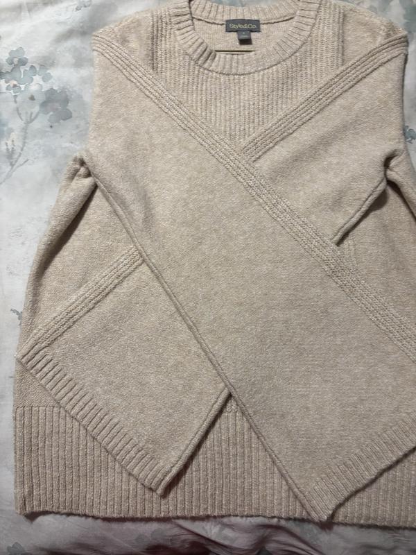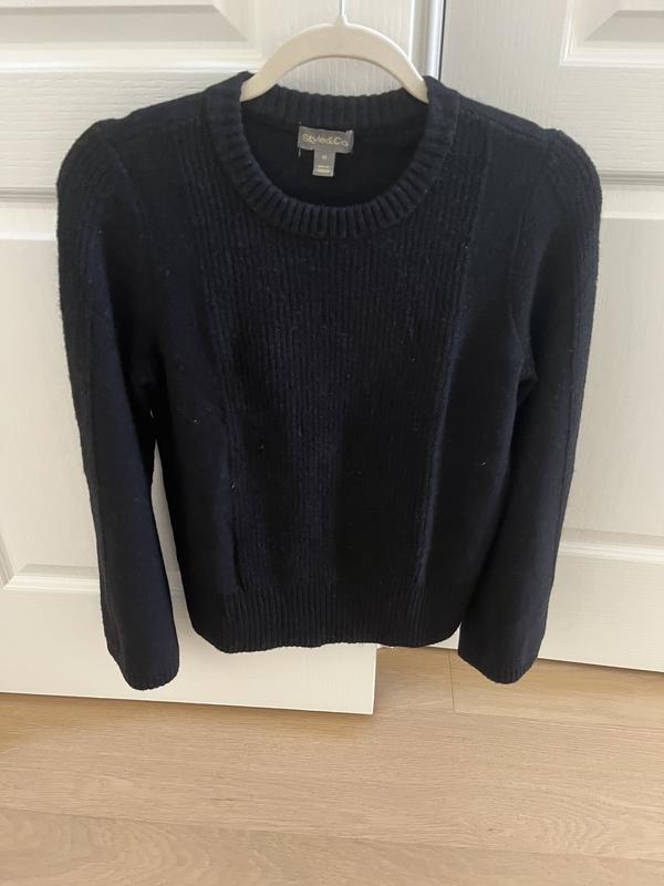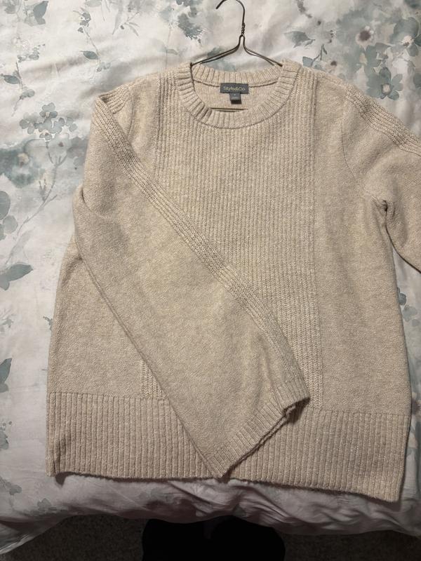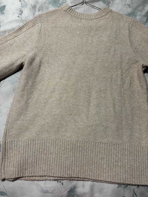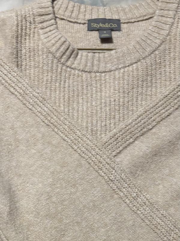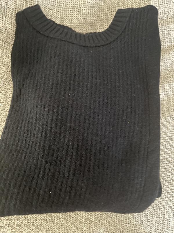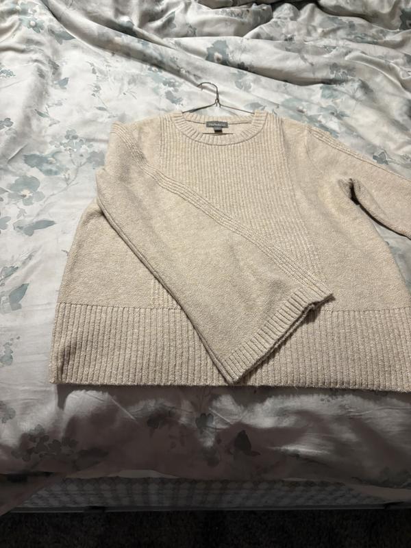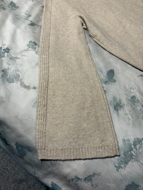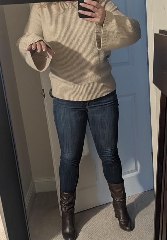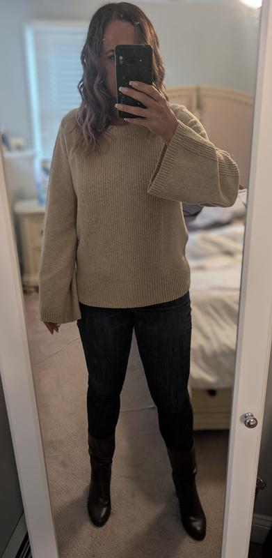 Comfy and stylish sweater. Gives a classic look but offers a flare. I love the sleeves that flare out and the look it gives. True to size. So soft and comfortable. Warm but not super thick material which is great for transitioning into the cooler temperatures.