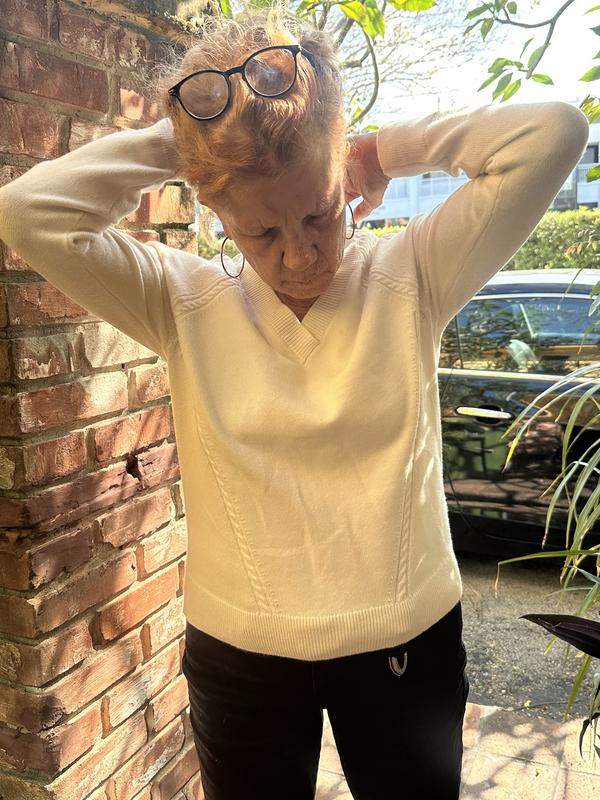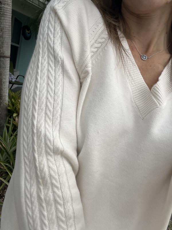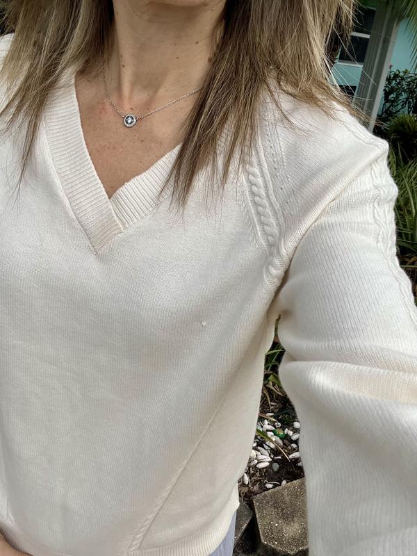 This a an absolutely beautiful and comfortable sweater by Style&Co. The color is a perfect off-white that pairs wonderfully with so much in my closet. The little detailing on the sleeves and neckline really make it pop and look classy. It provides just enough warmth for cool days but light enough that it’s not overly heavy. The fit seems to be true to size. It’s an amazing piece to add to your closet as a staple clothing item.