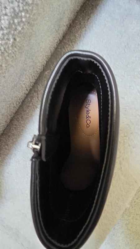 Beautiful glossy finish and true to size. This specific black pair is extremely versatile. You can wear it casual ,with jeans, dresses and skirts.Its zipper makes easier to put it on and take it off. A beautiful and unique folded top give its that chic look.