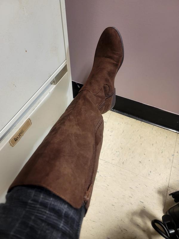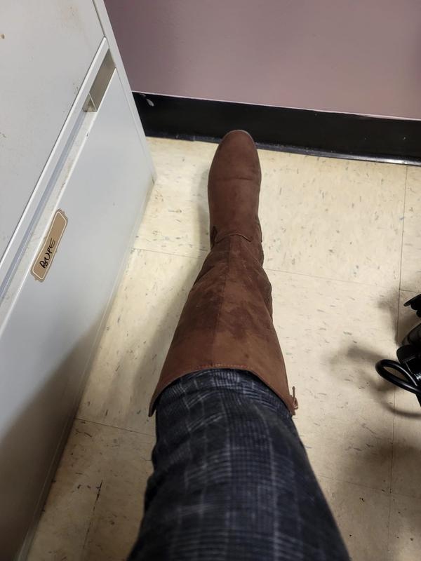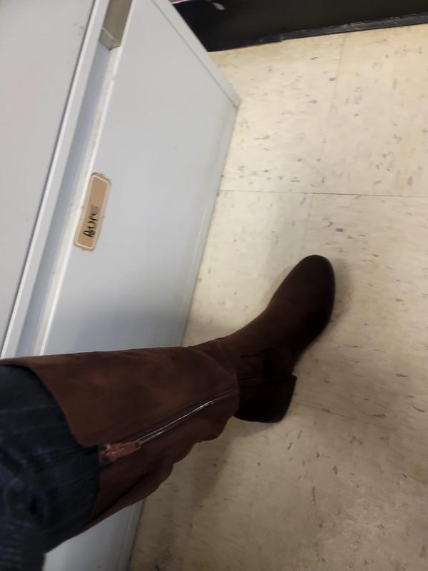 Love the rich brown color! Can be dressed up or down. The heal is small so very comfortable to wear all day! I only wish they weren’t as wide in the calf.