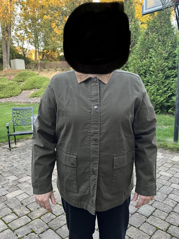 This moss green mid-weight barn jacket is so cute. At 26.5” long, it hits me top thigh on my 5’5” frame. Behind the dark camel colored corduroy collar and the sleeve cuffs is a floral fabric in blue, green, and tan. The front features a brass zipper that is hidden by a tab placket featuring burnished bronze snaps. The 2 front pockets feature a side entry as well as a top entry. The 98% cotton, 2% spandex fabric has a slight stretch to it allowing me to be able to wear a lightweight sweater underneath. Therefore, I recommend buying your regular size.