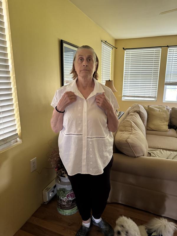 This shirt is so lovely, comfortable, & flattering. I get lots of compliments on it. It is comfy and pretty. I love that it’s not too big and boxy but still doesn’t show every bump or bulge. I was so happy with this white one, I went back and ordered the blue one later.