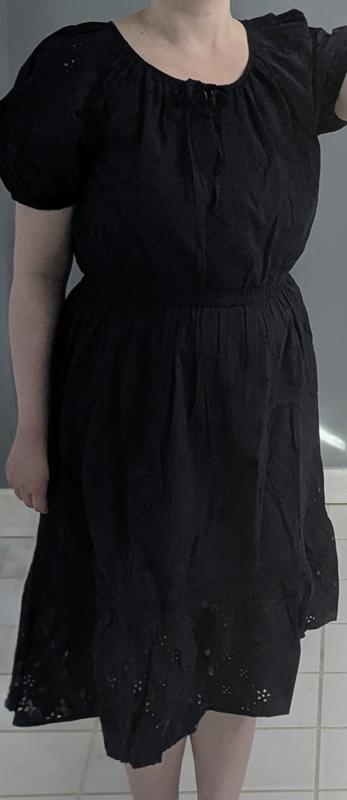 This cotton eyelet dress is very cute, one and done outfit for everyday wear. I am so happy I found it in the store and was able to try it on. I am between sizes 6/8 and the small fits very nice. It has cinched elastic waist so you do not need belt, but I will use belt some times to change the look. Great buy because it was on sale.