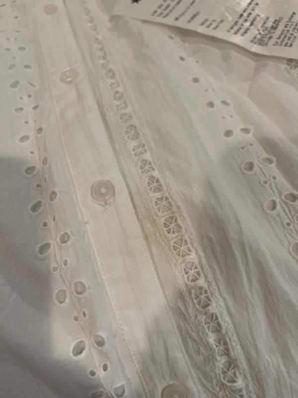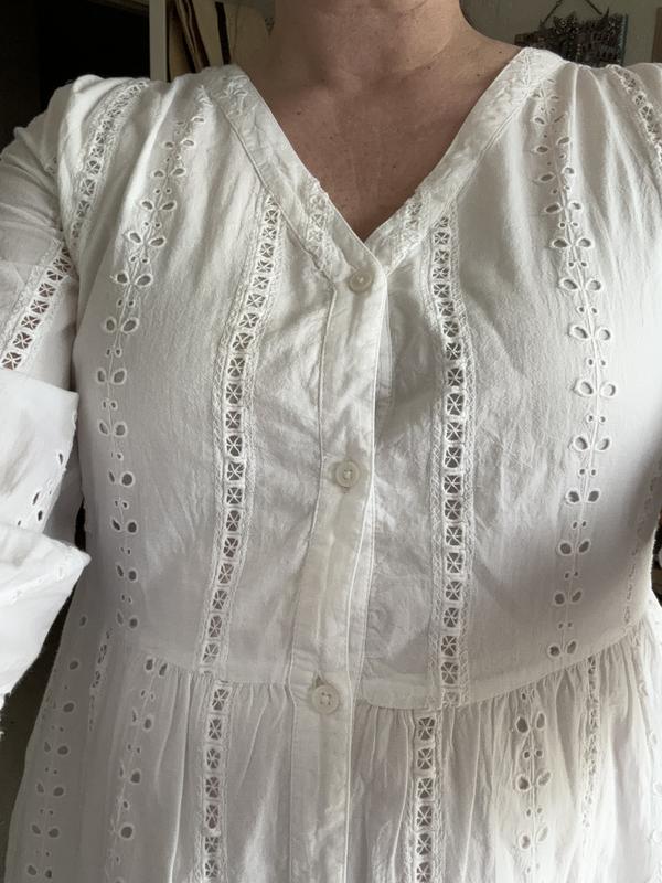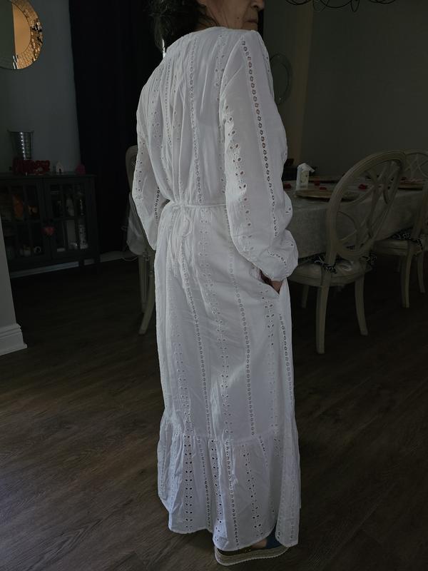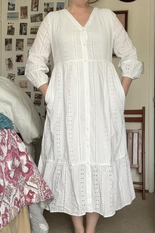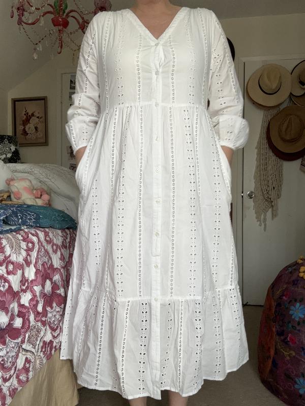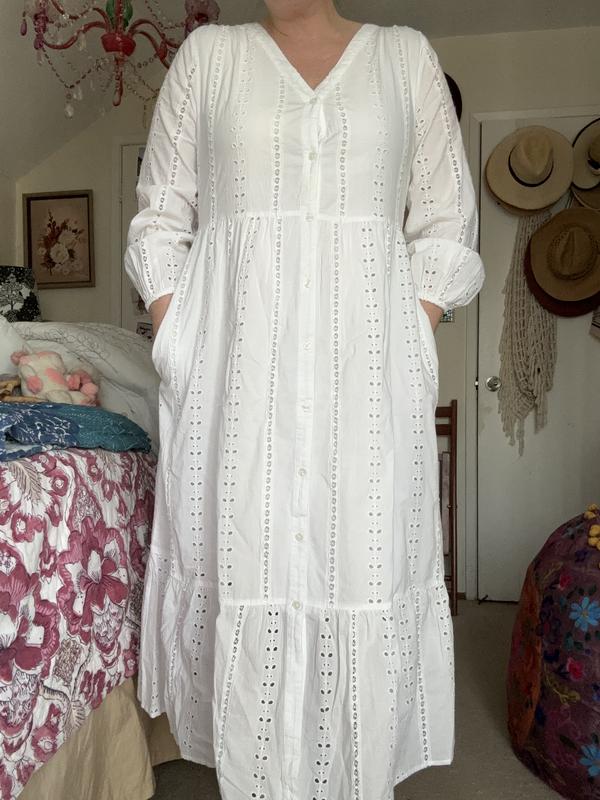 Nice all cotton dress. Full lining except sleeves provided ample coverage yet still cool and breezy. Pretty eyelet. Comfortable and cute