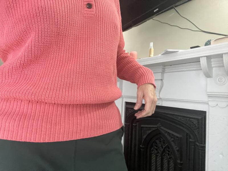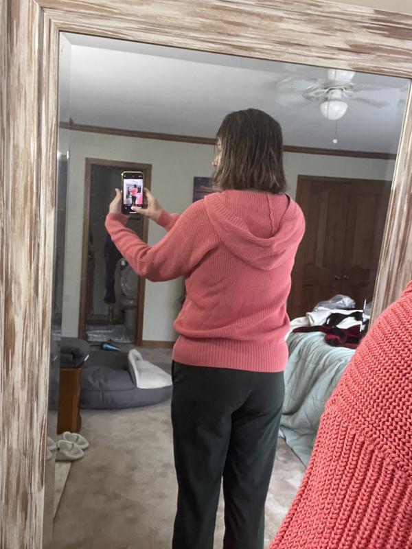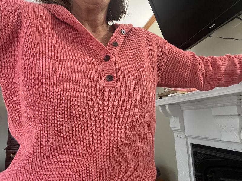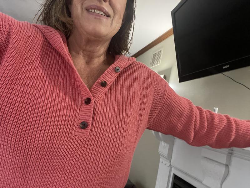 I love the fit, length and feel of this sweater. It is so comfortable to wear and sits in the perfect place at my hips with jeans and workout pants. It is well made and soft and the buttons make it dressed up enough to wear to work.