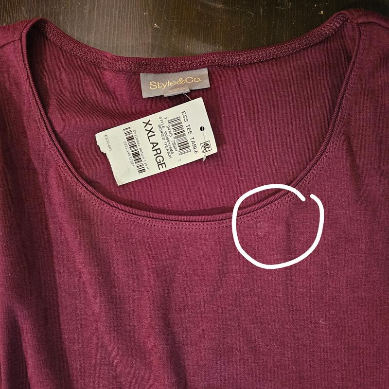 Macy's shipped me someone else's returned shirt that has a stain on it with tag showing that it is a return. On the shirt, this is NOT cotton. Style & Co. used to be one of my favorite brands for casual tops. The shirt feels silky and it is shear. This is most likely because of the mix of cotton and polyester with a heavy hand on the polyester. Lesson learned. So very disappointing.