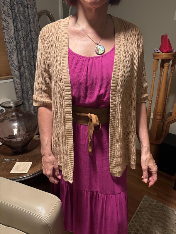 A comfy cardigan to wear over dresses for work. It runs rather large, so downsize.