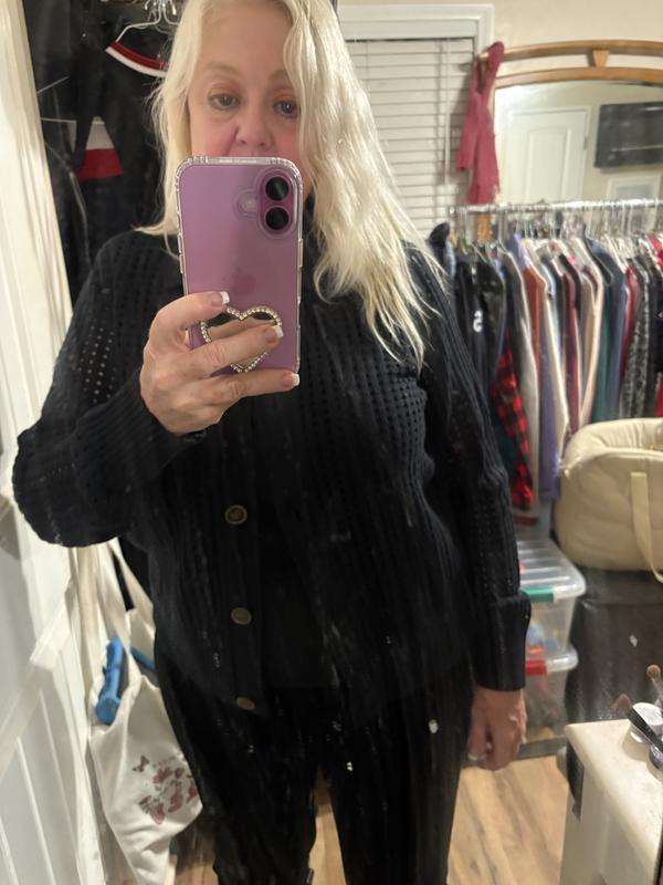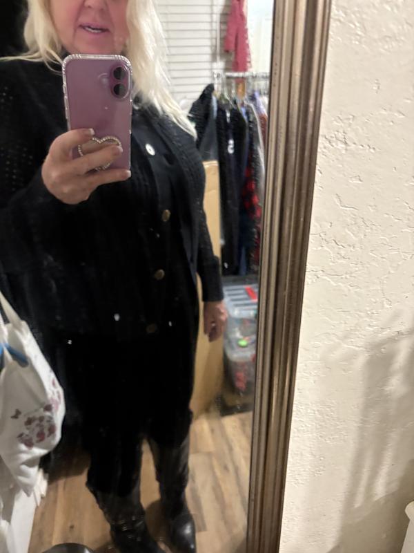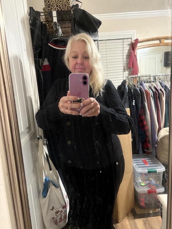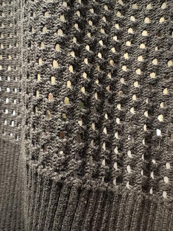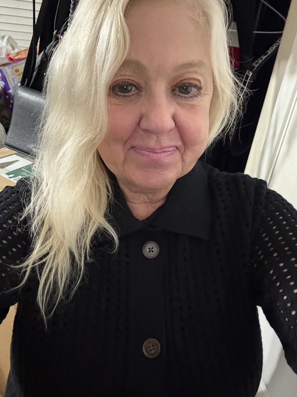 Comfortable sweater, it has lovely see through stitching I love how warm it is even with the stitch pattern perfect for day and night. Material feels nice and very good quality. Love this beautiful cardigan overall