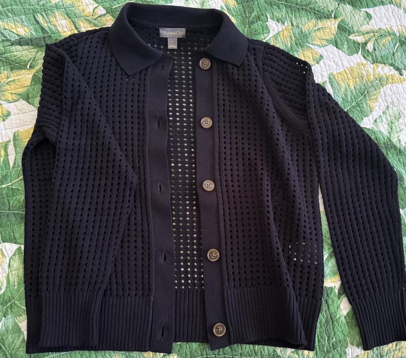 This sweater is made of very heavy material with see through holes throughout it that will highlight whatever shirt you wear. You must wear something under it. It is very well made. 100% cotton. Black with nice brown buttons. The collar is very nice. There is a cuff area on the sleeves. Quite conservative in my opinion but stylish.
