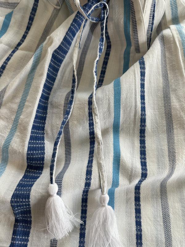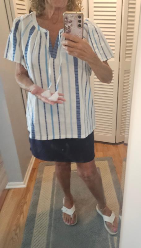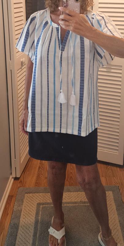 I loved this shirt in the photos, but it's going straight into my donation bin. The Medium is super large on me and the sleeves puff up on top. I look like I've got a parrot hiding on each shoulder. I tried patting the fabric down but there's still a pouf. Combined with the oversize and stripes, it's decidedly not flattering. Even my lovely husband, who seldom notices clothes, commented on how much he disliked this shirt. I'm so disappointed - it looks so gorgeous in the photos!
