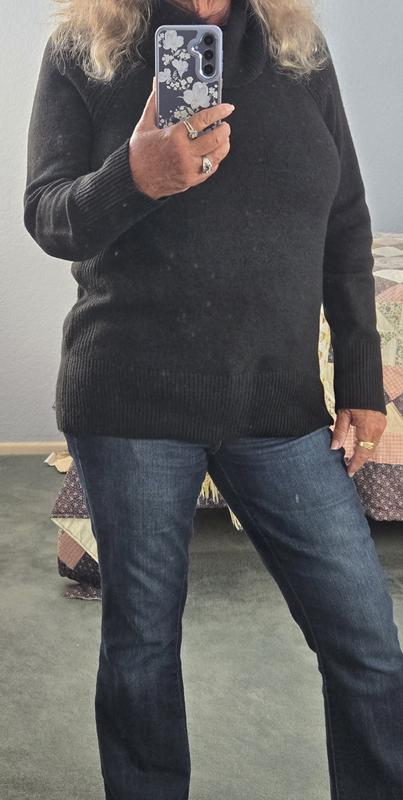 With the approach of winter if i could I would give it 10 stars. This is an amazing classic clothing item. The feel of the sweater is incredibly soft. It is shaped enough not to feel boxy and body length is just below the hip. It is a cowl neck with enough fabric to drape beautifully. Bottom line a medium weight sweater i can whole heartedly recommend.