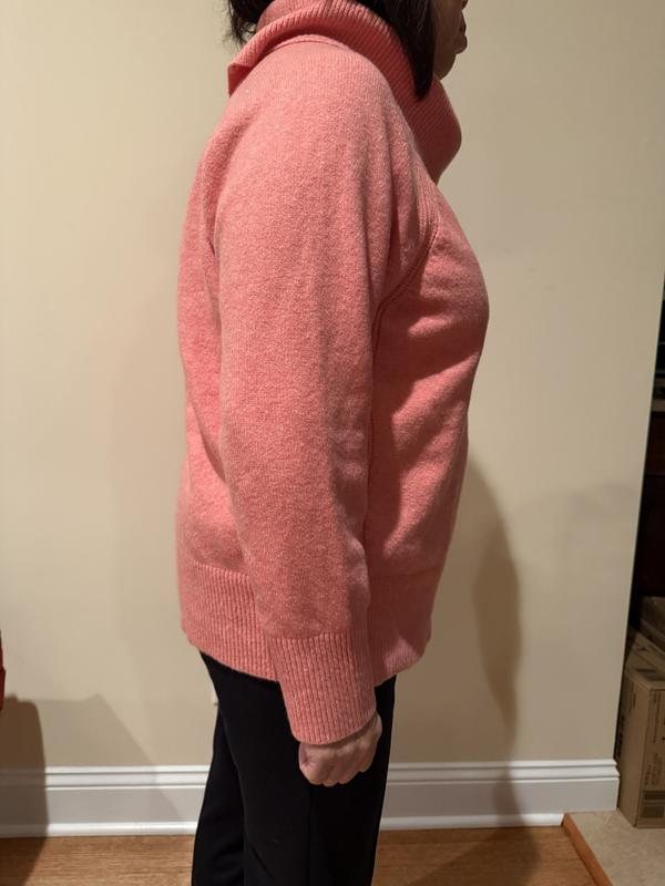 Beautiful and soft. Lightweight enough to wear under a jacket and great alone with a down vest. Warm neckline means you don't need a scarf. I love it and got it in two colors.