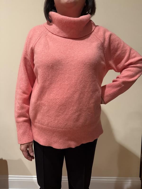 Light weight sweater with roomy cowl neck. I got an XL because I like my sweaters roomy and slightly baggy. The color coral is very pretty. The quality is okay, it says machine washable but I think it needs to dry flat which is an inconvenience.