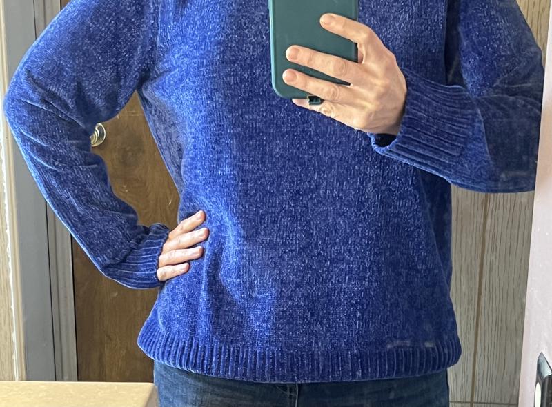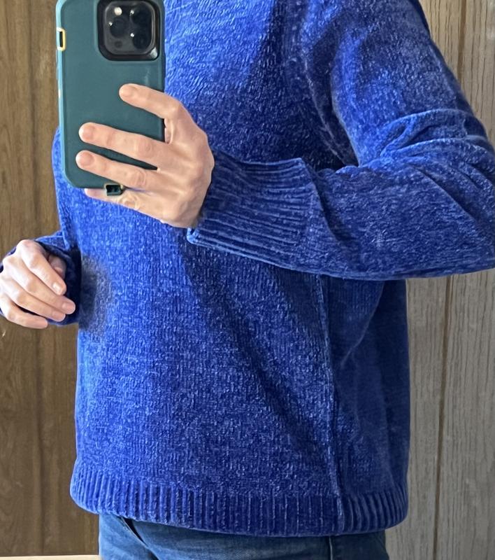 Soft chenille knit that wears well dressed up or down. The fit is standard and shipping was fast. Good value for the money.