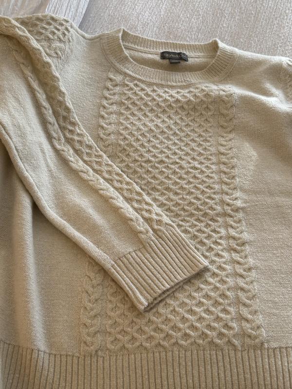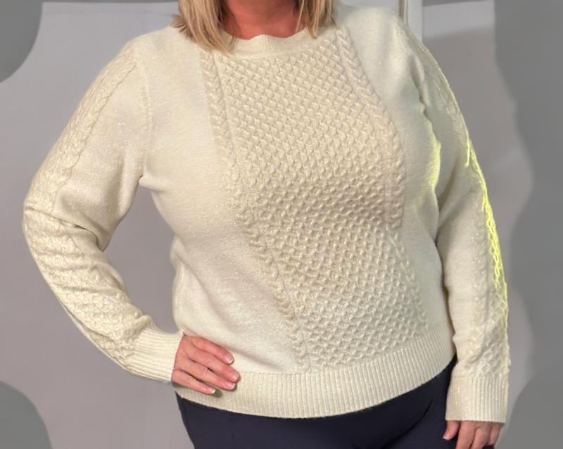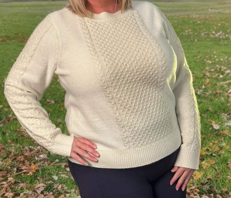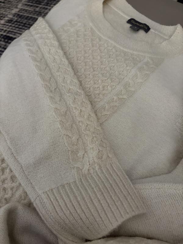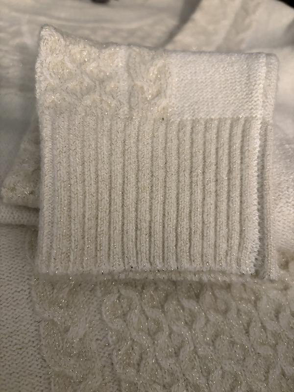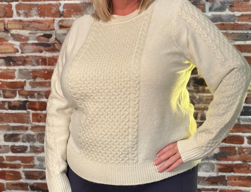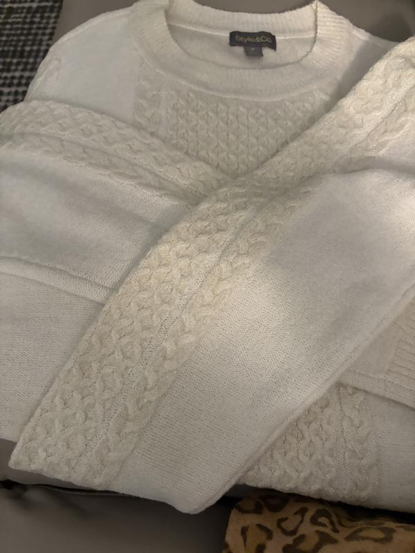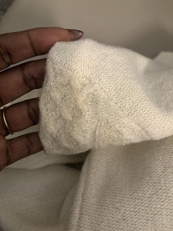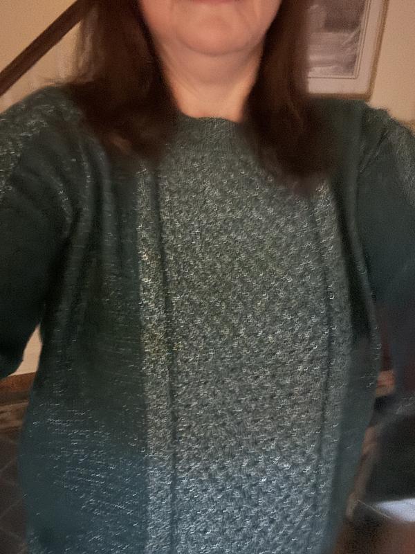 A nice sweater with a bit of sparkle that can be used for every day or dressed up. It is very soft and has a slight puff at the shoulder. I liked the sweater, but would have preferred it be a bit longer.