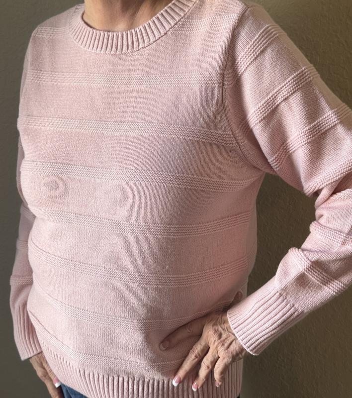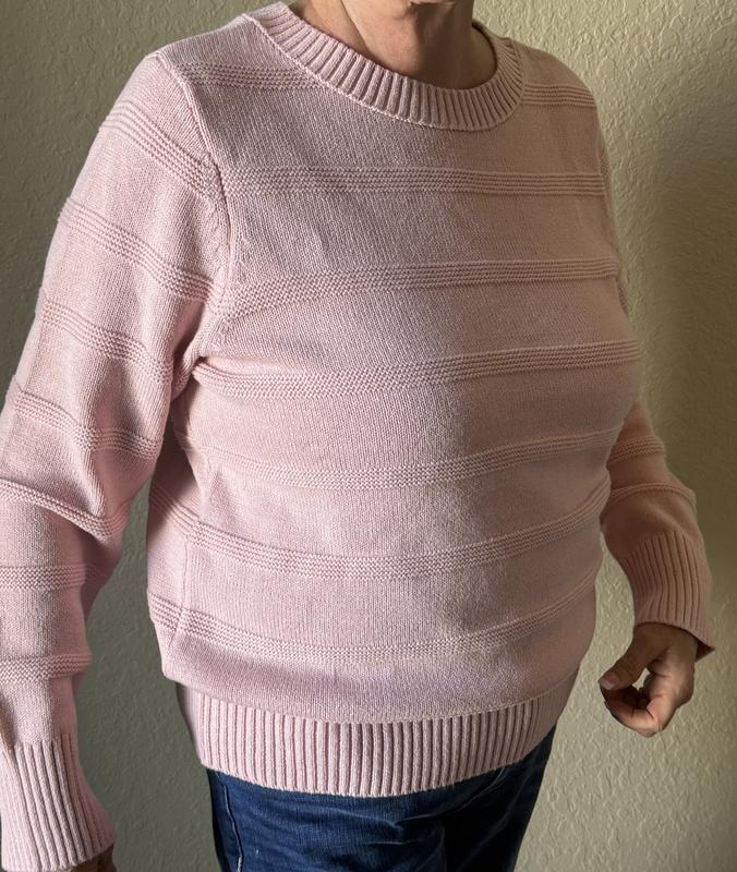 I’m really happy with this sweater! The cotton blend knit makes it super soft and comfortable without feeling heavy which is nice on chilly days. The light pink color is beautiful and looks great with blue jeans. The long sleeves and round neckline give it a classic, easy-to-wear look, and the subtle knitted pattern is a nice touch that breaks up the plain fabric and adds a little style. I ordered a size large and it fits great (I am 5'-4" @ 138) This is a nice addition to my casual attire.