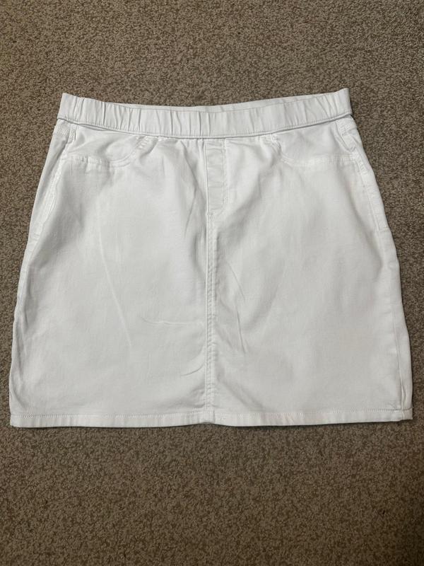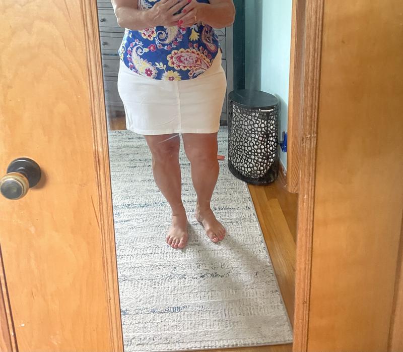 I'm 5'3" 140# and bought the Medium. It fits perfect. The denim is Very Soft. The color is beautiful. I love this skirt. The waist is Very forgiving and comfortable. Easy On Easy Off ...