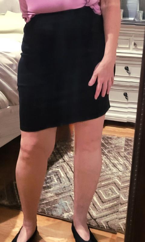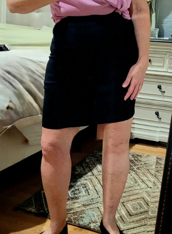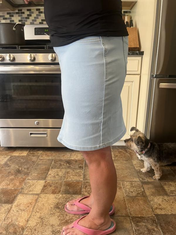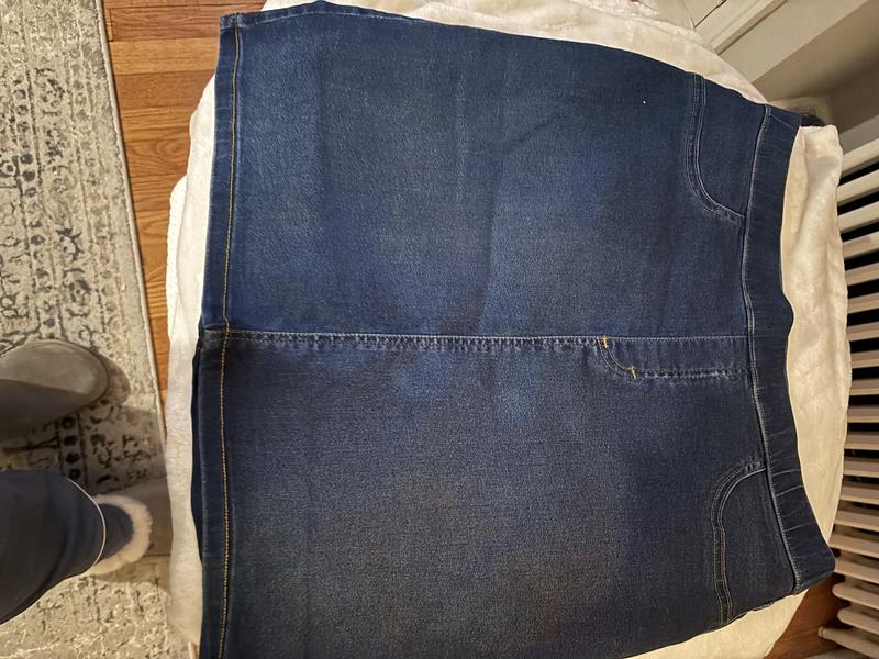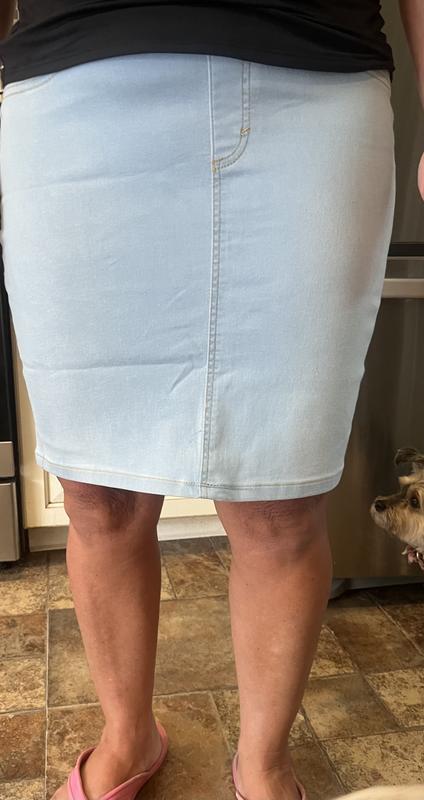 This skirt is THE BEST! Cute & comfy. Denim is soft and lightweight, but not see-through. Back pockets are useful. Front is nice and smooth. Fit is not floppy A-line or tight pencil, but just right!