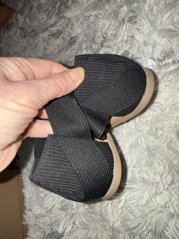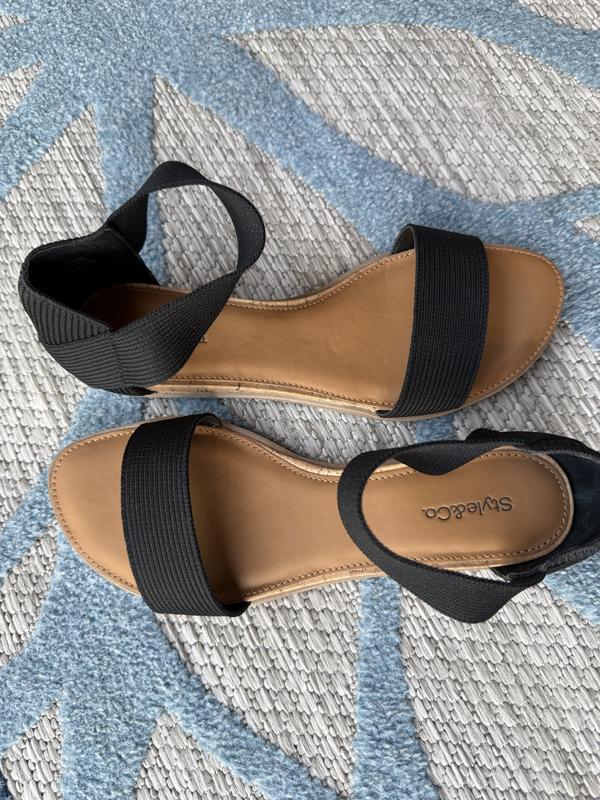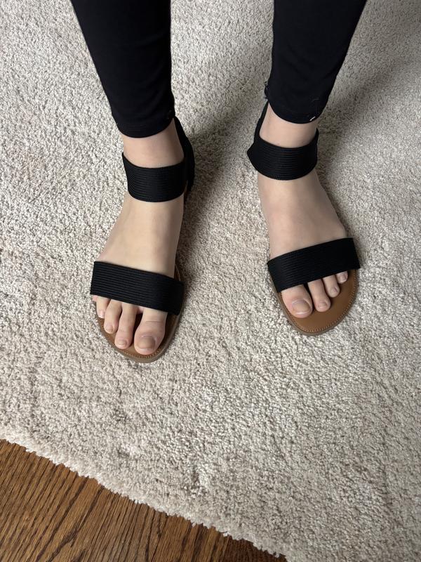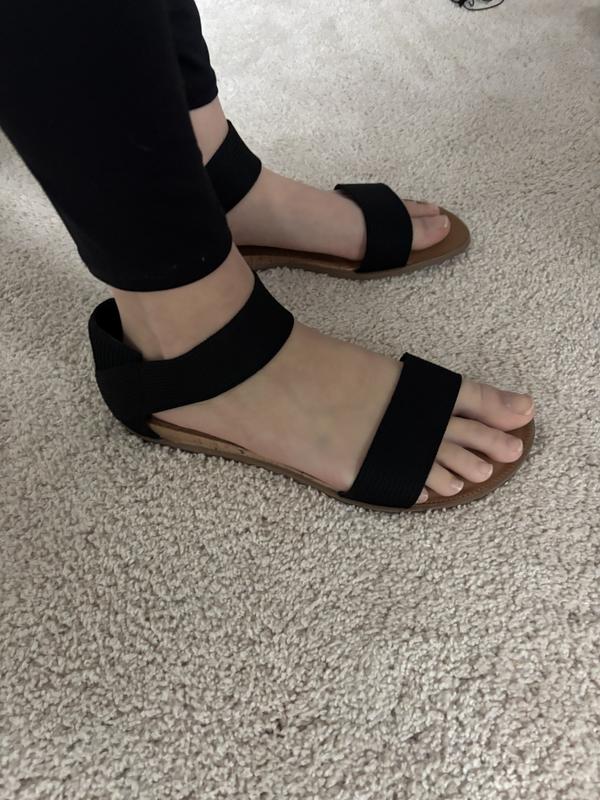 I got these sandals in black. They are cute and have a black strap around the ankle that is comfy, doesn’t dig into ankle at all. There is not a lot of arch support. Will look great with jeans or a skirt this summer.
