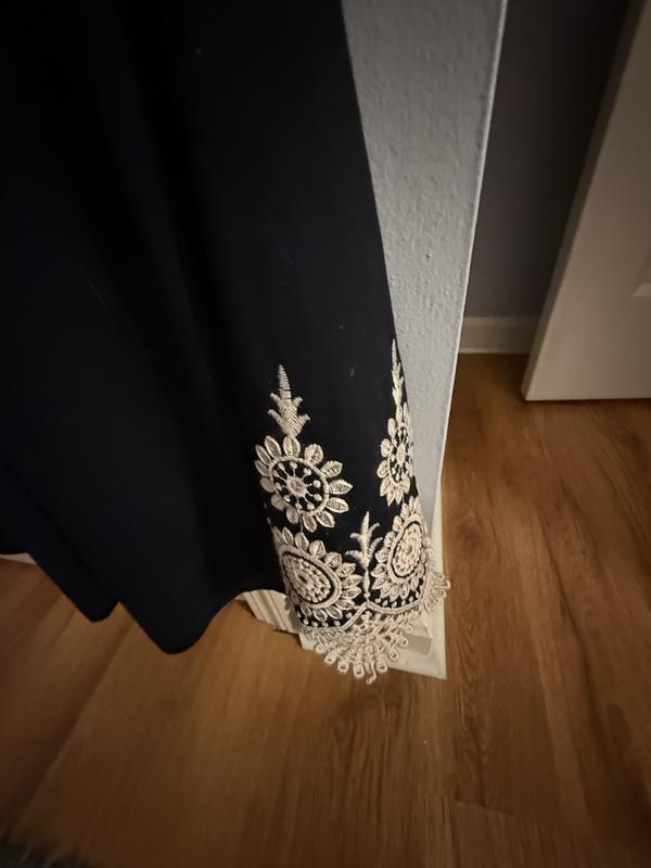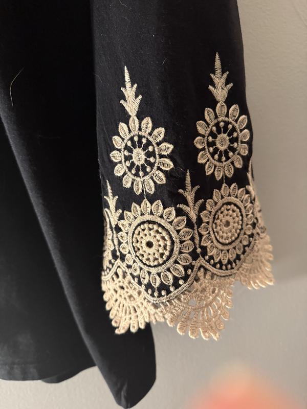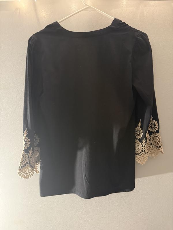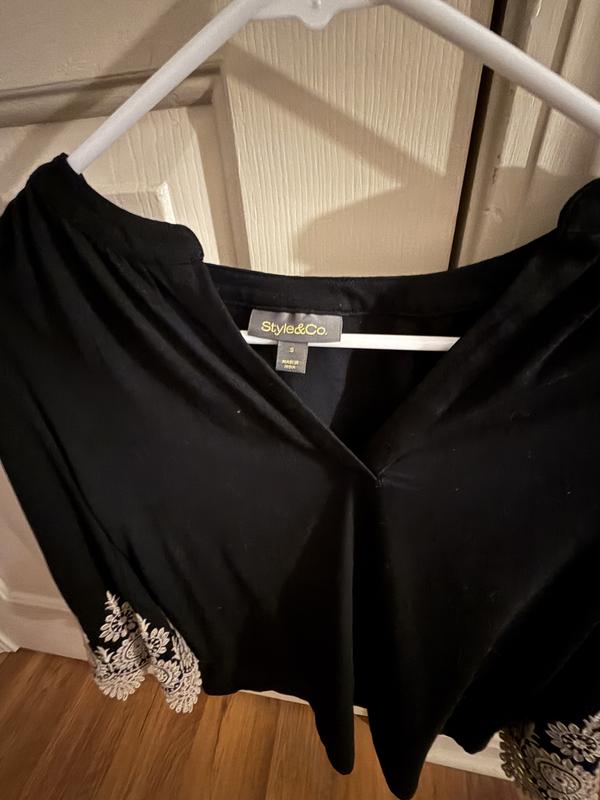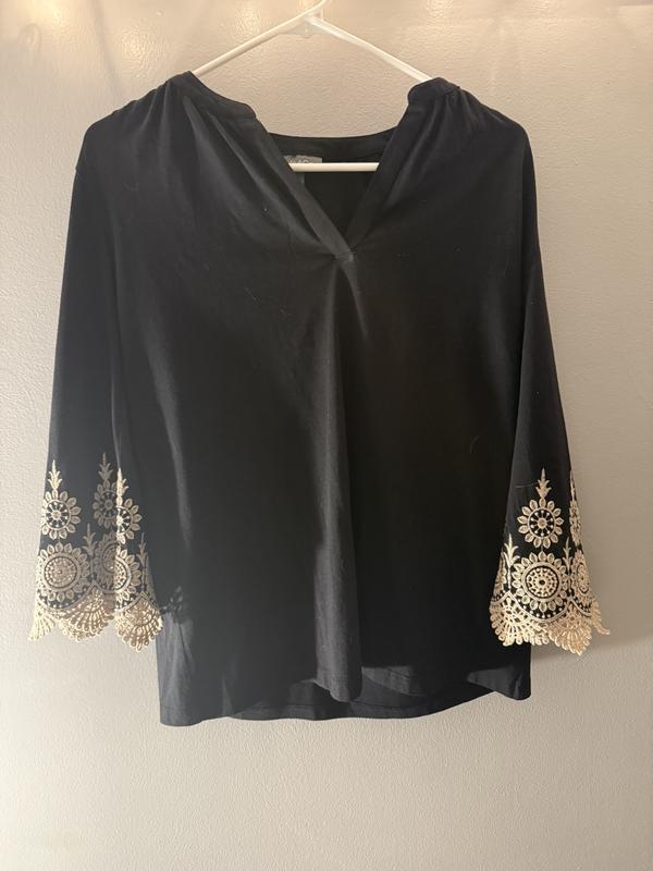 Style & Co Embroidered sleeve top. Black v-neck top with 3/4 length embroidered sleeves in black. Embroidery on the sleeves is a natural looking tan. Embroidery on the 3/4 sleeves is nicely detailed and the shoulders are pleated adding to the details of this top. It runs a little large and long.
