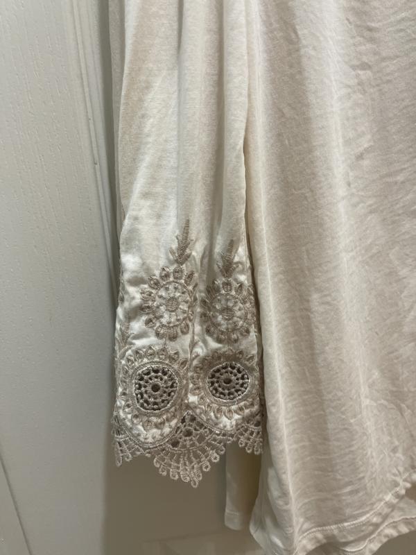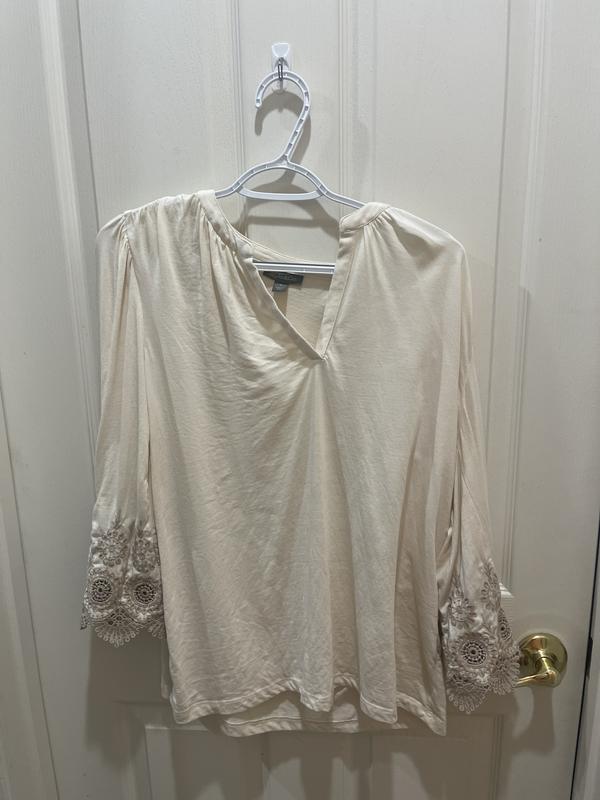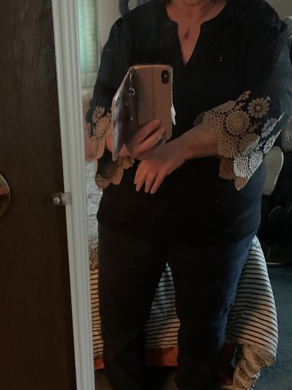 This 3/4-sleeve top is flattering and flows nicely. Since the blouse flares, it strategically minimizes and hides the middle torso area. The intricate design in the embroidered cuff adds a boho chic touch. The downside is that it wrinkles easily.