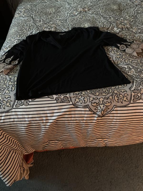 This is a beautiful blouse! The material is silky, but it glides over any problem areas. The V-neck is flattering, but just the right size. It’s attractive without being too low. The sleeves are absolutely beautiful. The embroidery on the ends is gorgeous and soft. I like the length of the blouse as well. It hits mid hip flattering length that’s not too long. The fit is slightly generous. You can definitely go down a size and it would still be appropriate. I washed it in cold and hung it to dry.All in all I highly recommend this beautiful blouse.