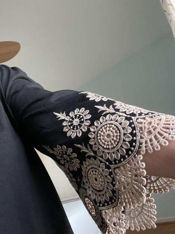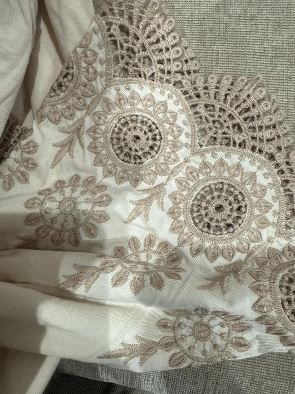 Delicate and trendy. Fits good enough.May wrinkle after wash. Pure cotton. Embroidering looks a bit rough on real.
