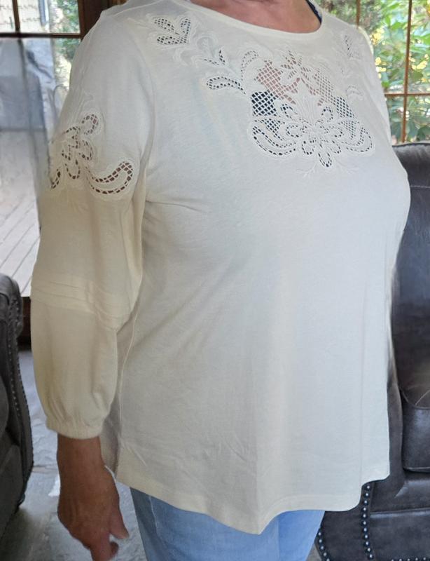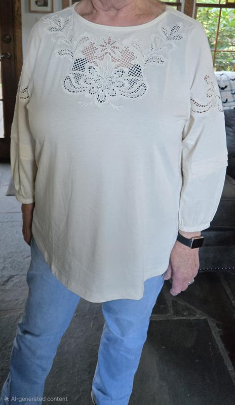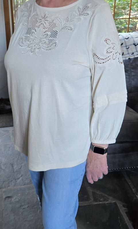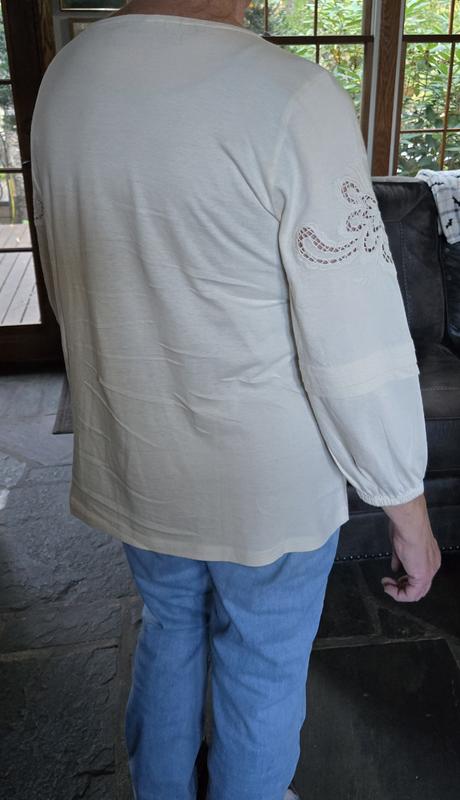 This Style & Co cotton blend top is not only beautiful to look at, it's comfortable too! The stylish yoke and full, detailed sleeves give this blouse that extra special look. Although the cream shade is not my favorite, the deep wine color was not available in my size (XL). I decided to go for it anyway, and am glad i did. The fabric is lightweight and as said above, very comfortable. It washes and dries like a dream. You can see in the photos just how lovely this top is. If you enjoy a breezy, casual top with style, this is the one for you!