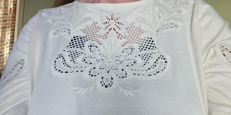 Embroidered Lace-Trim Blouse Look at the embroidery….it’s BEAUTIFUL!!! Deep, rich color…perfect for fall / winter! The material is soft and lightweight, making it perfect for cooler weather. DID NOT FADE AFTER WASHING!!!!! This is a size medium…I am 5’ 8” and about 135 lbs and I love the way it fits!!! The embroidery on the chest is located high enough on the blouse to eliminate concern about what to wear underneath. The arms also have embroidery and it does not make the fabric stiff…just adds to the soft look of the blouse. I wish I could take better photos because this top is MUCH lovelier than the photos I have posted….