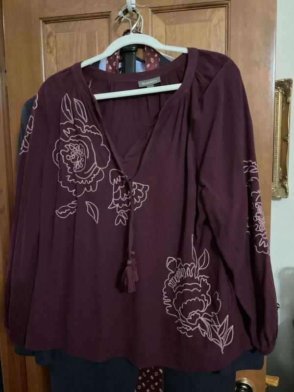 I purchased the wine colored crepe peasant top which has beautiful embroidered flowers in a lighter color. However, it is difficult to wash as it can shrink easily. Do Not put in drier! I've received lots of complements!