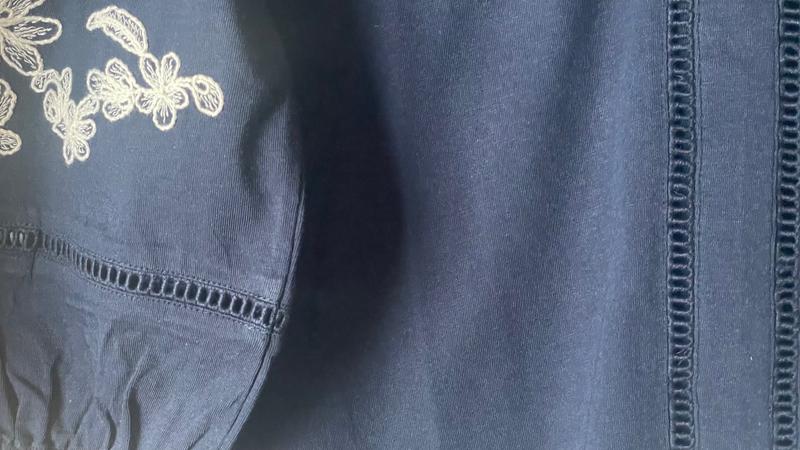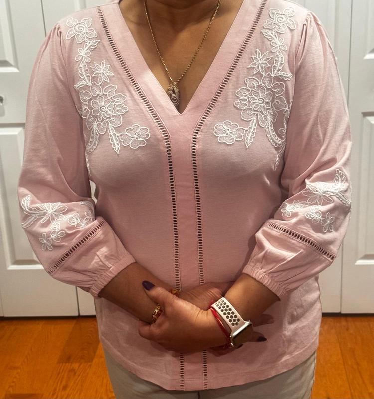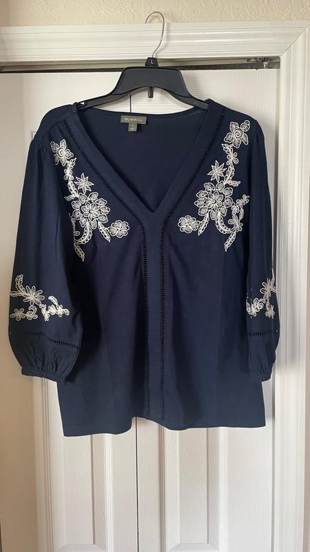 This blouse is striking! Beautiful embroidery on the front and on the sleeves. Made with a soft, cozy material feels like a blend of cotton and modal. Jersey knit with some stretch. I’m generally a 2X but I bought this in an XXL as this style is not offered in plus sizes. The XXL fit because this top has stretch in it. However, a plus size 2X would probably fit me a bit better. Macy’s PLEASE MAKE MORE TOPS LIKE THIS ONE AND OFFER IT IN PLUS SIZES!!!!!!