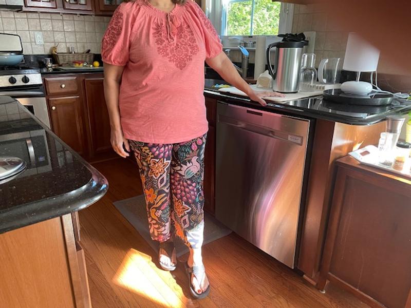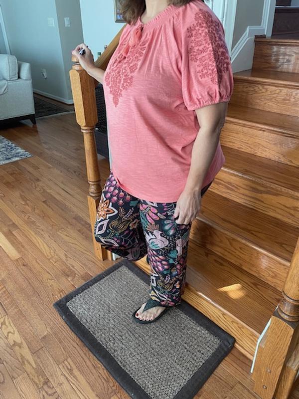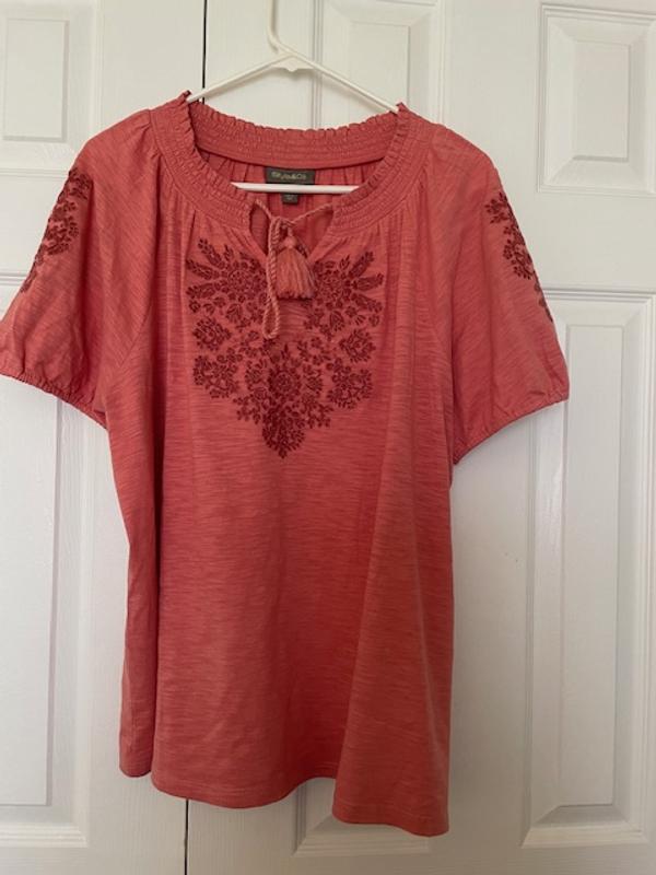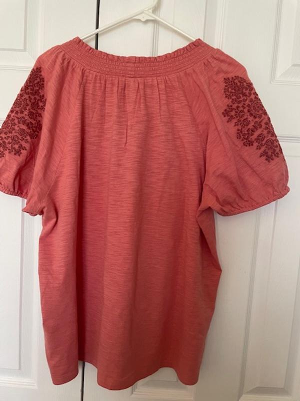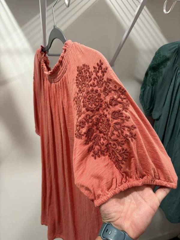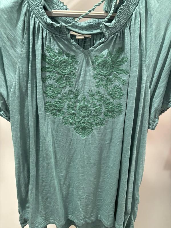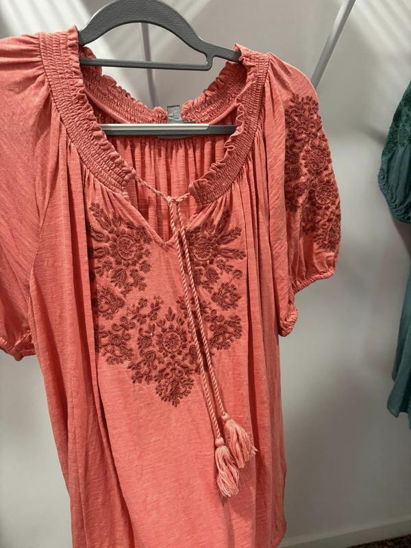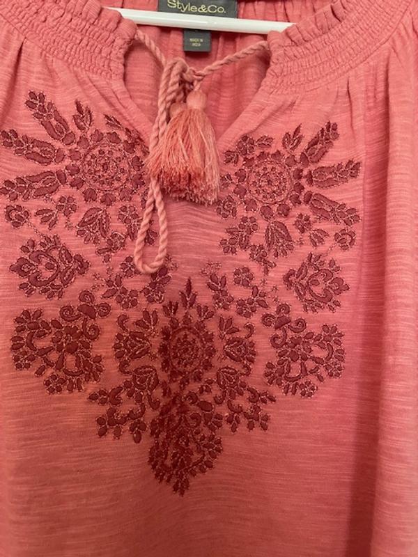I was in Macys to pk up an order thought while im here let me browse and see if I can find a top for a pair of Capris I bought awhile back. And yes I found the perfect top in I thought was the right color. The style is perfect comfortable and cab be worn in or out . The embroidery is so pretty and little puff sleeve is just right. Love.