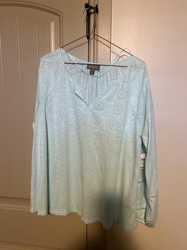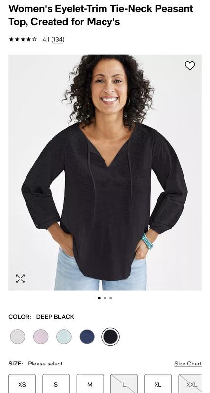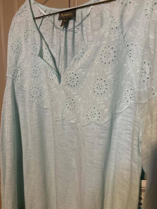 Nice summer top. Love the eyelet details. Very comfortable in hot weather. True to size