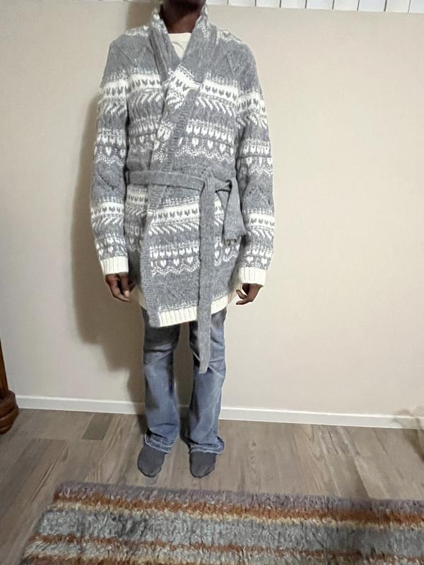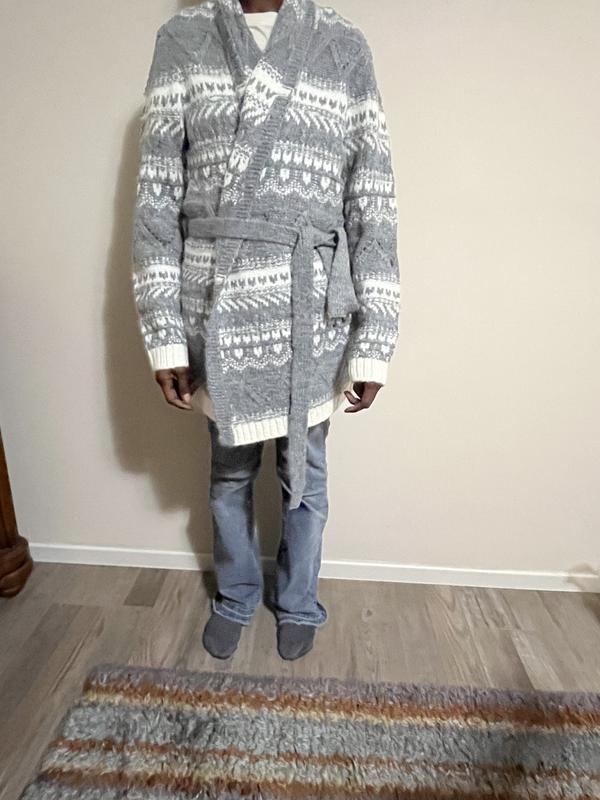 This sweater is really nice quality; thick, warm, and perfect for casual outings or even the office on cooler days. I like that it has a belt so you can tie it closed, which makes it more versatile. The pattern isn’t really my favorite, but it’s not a dealbreaker; I’d still wear it and pair it with the right outfit to make it work.