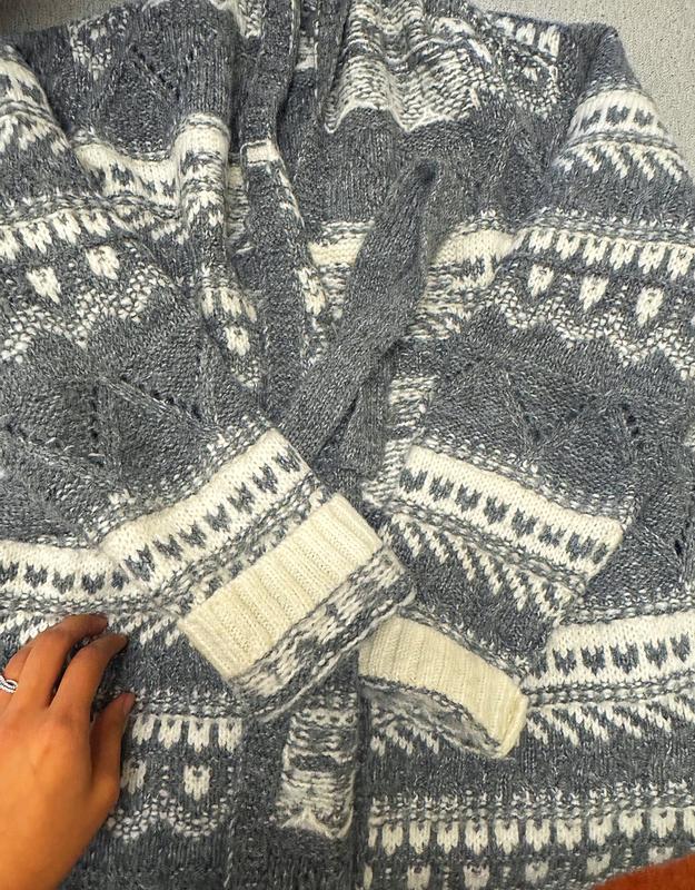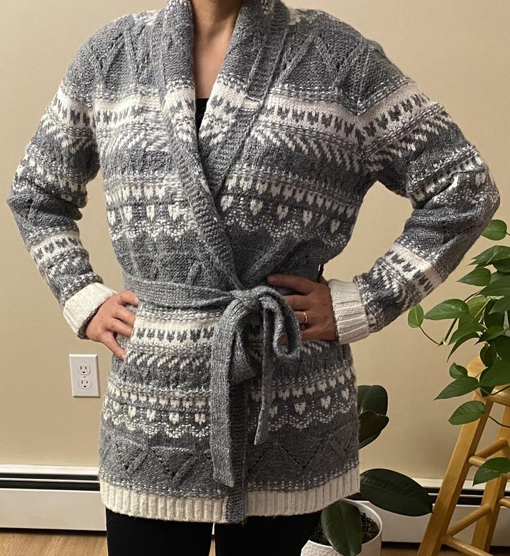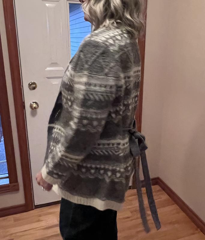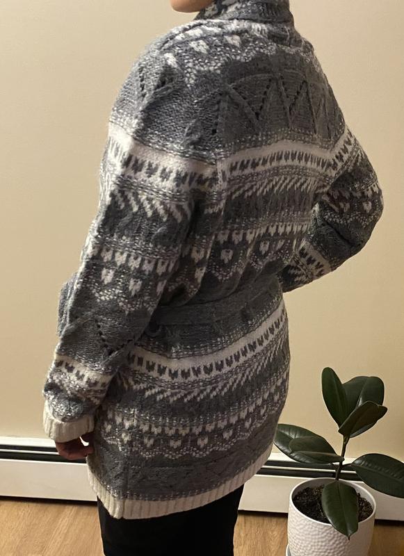 This sweater is really nice quality; thick, warm, and perfect for casual outings or even the office on cooler days. I like that it has a belt so you can tie it closed, which makes it more versatile. The pattern isn’t really my favorite, but it’s not a dealbreaker; I’d still wear it and pair it with the right outfit to make it work.