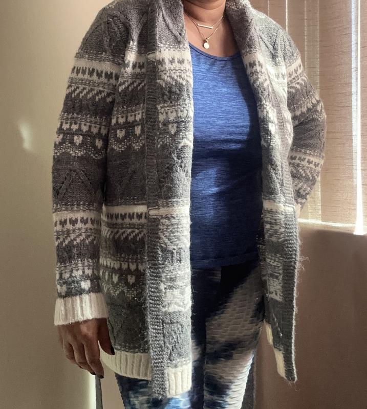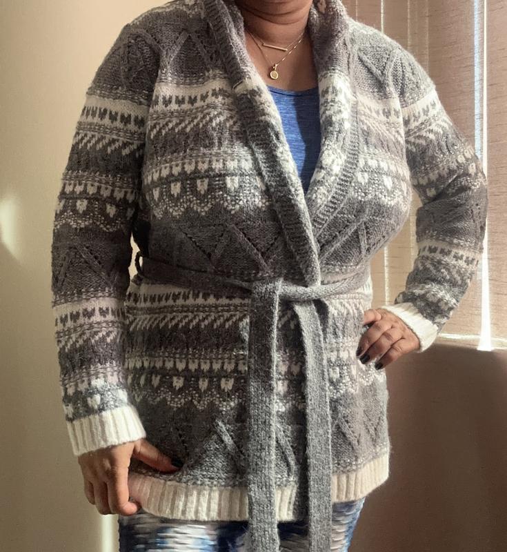 Love this cardigan! So soft, cozy and warm. Drapes beautifully, lengthy. Love the print. I prefer wearing it without the belt. Love wearing it with jeans. I will be wearing this beauty all winter long!