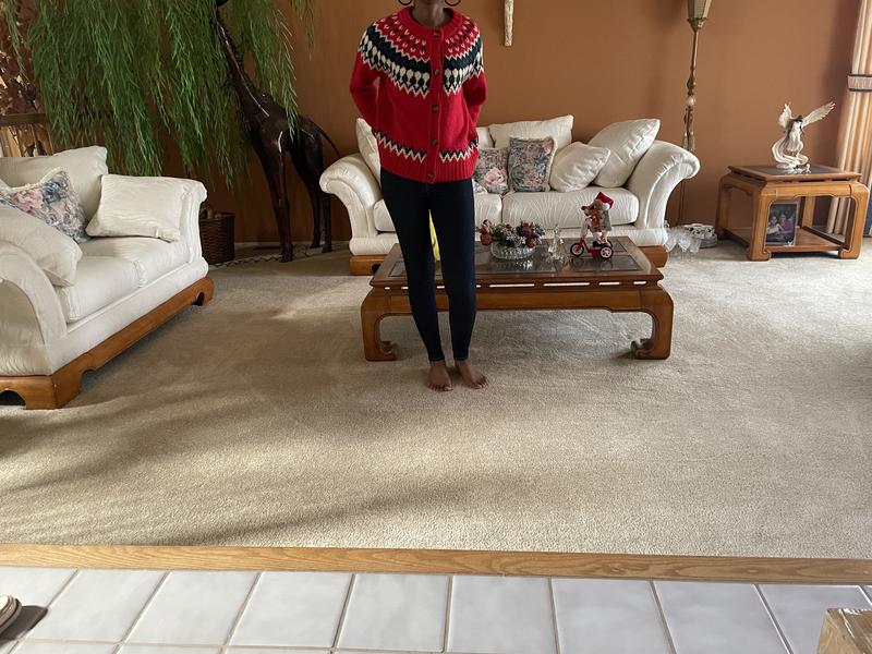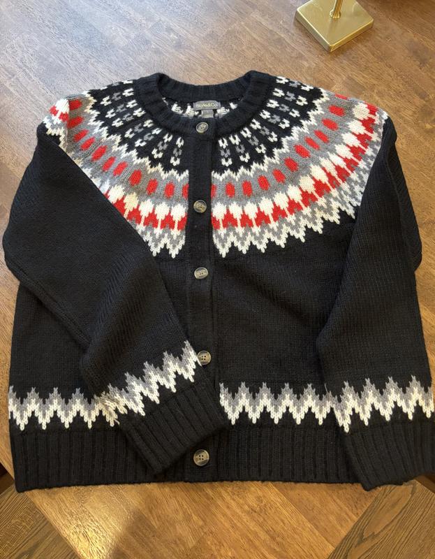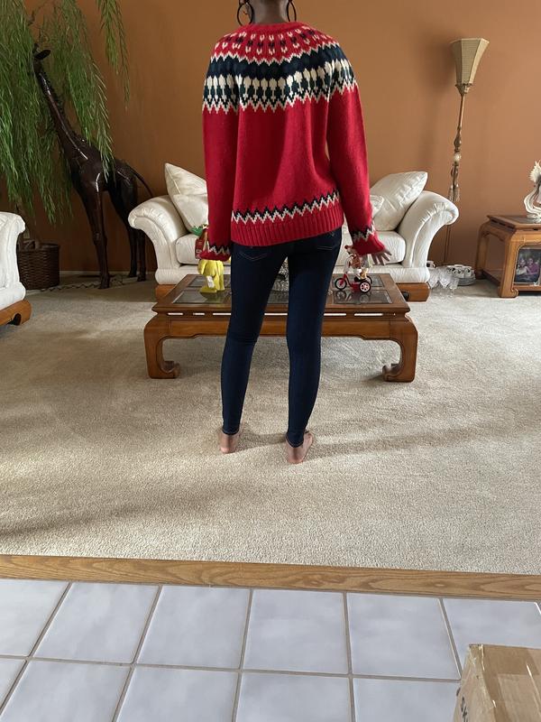 This is exactly what I was looking for. The colors are beautiful and there’s a little bit of sparkling gold thread in the white part. Festively subtle. The sleeves are a bit long but I can always bunch them up.