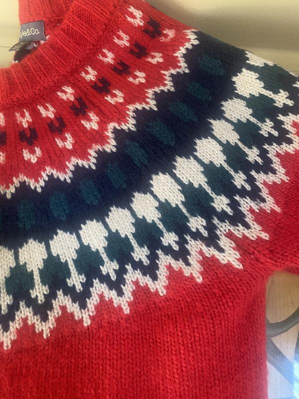 Vibrant and well fitting winter sweater. The material Is soft and warm, which I was pleasantly surprised by, due to it not being cotton. The red is bright and festive. I pair it with nice jeans, and it is a great layering piece.